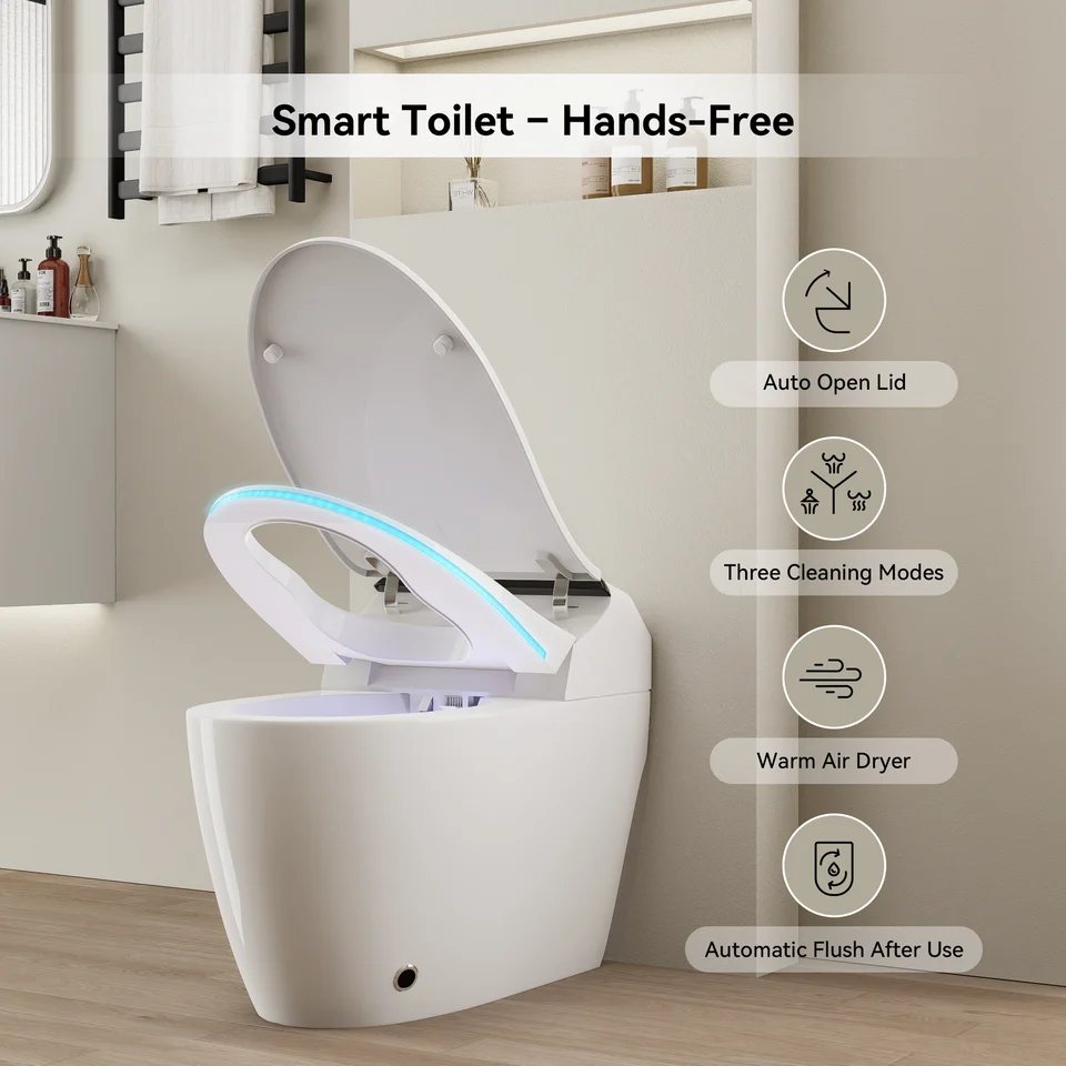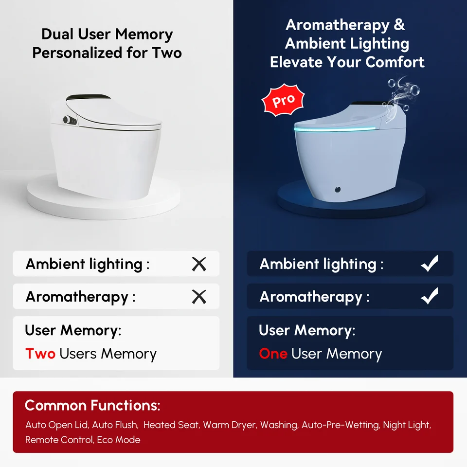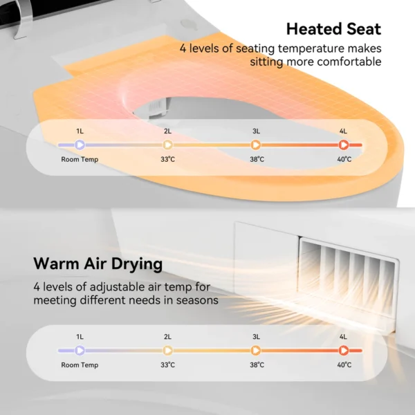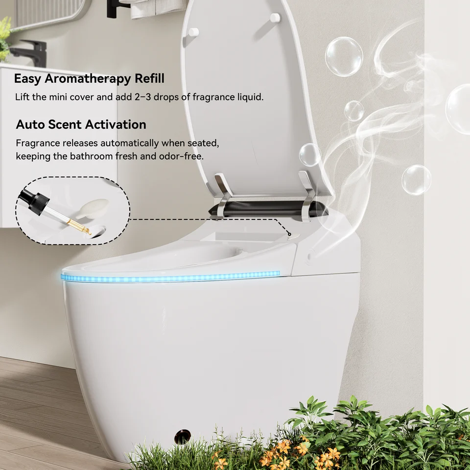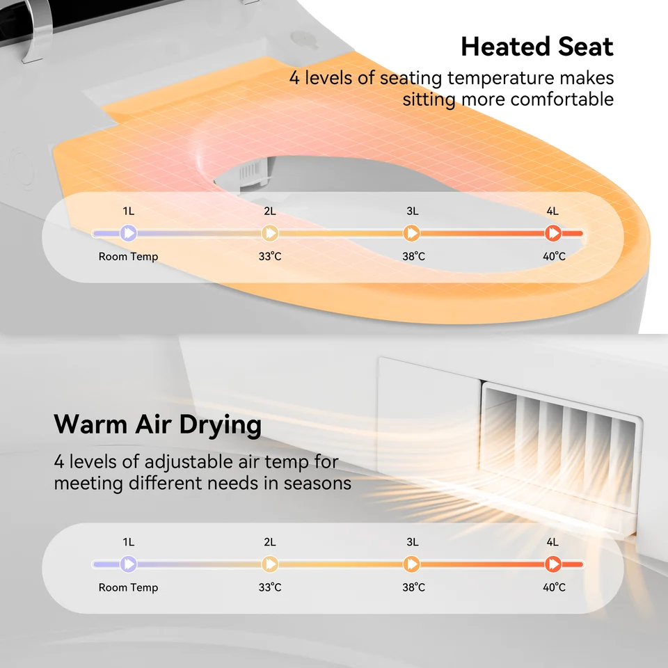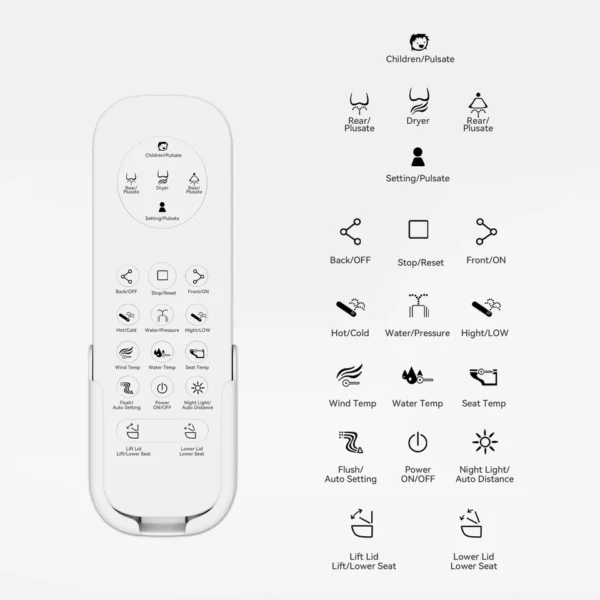 | Toilet Features | Heated Seat; Soft Close Seat; Auto Open Lid; LED Digital Display; Adjustable Nozzle; Adjustable Water Temperature; Nozzle Self-Cleaning; Warm Dryer; Adjustable Warm Wind Temperature; Aromatherapy; User Memory; Remote Control; Auto Pre-Wetting; Night Light; Eco Mode; Adjustable Water Pressure |