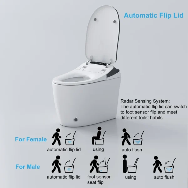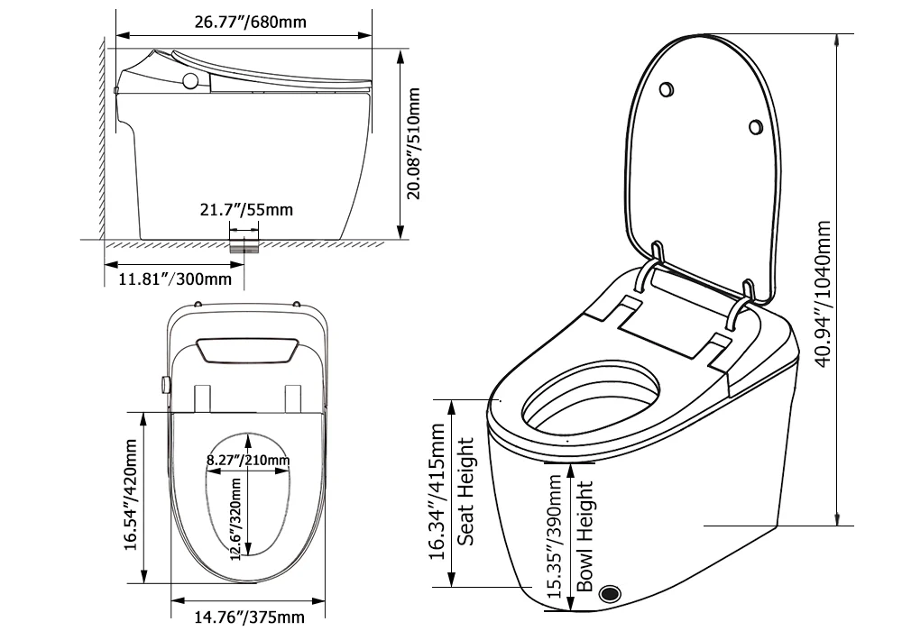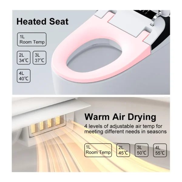 | Toilet Features | Heated Seat; Soft Close Seat; Auto Open Lid; LED Digital Display; Adjustable Nozzle; Adjustable Water Pressure; Adjustable Water Temperature; Nozzle Self-Cleaning; Warm Dryer; Adjustable Warm Wind Temperature |