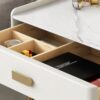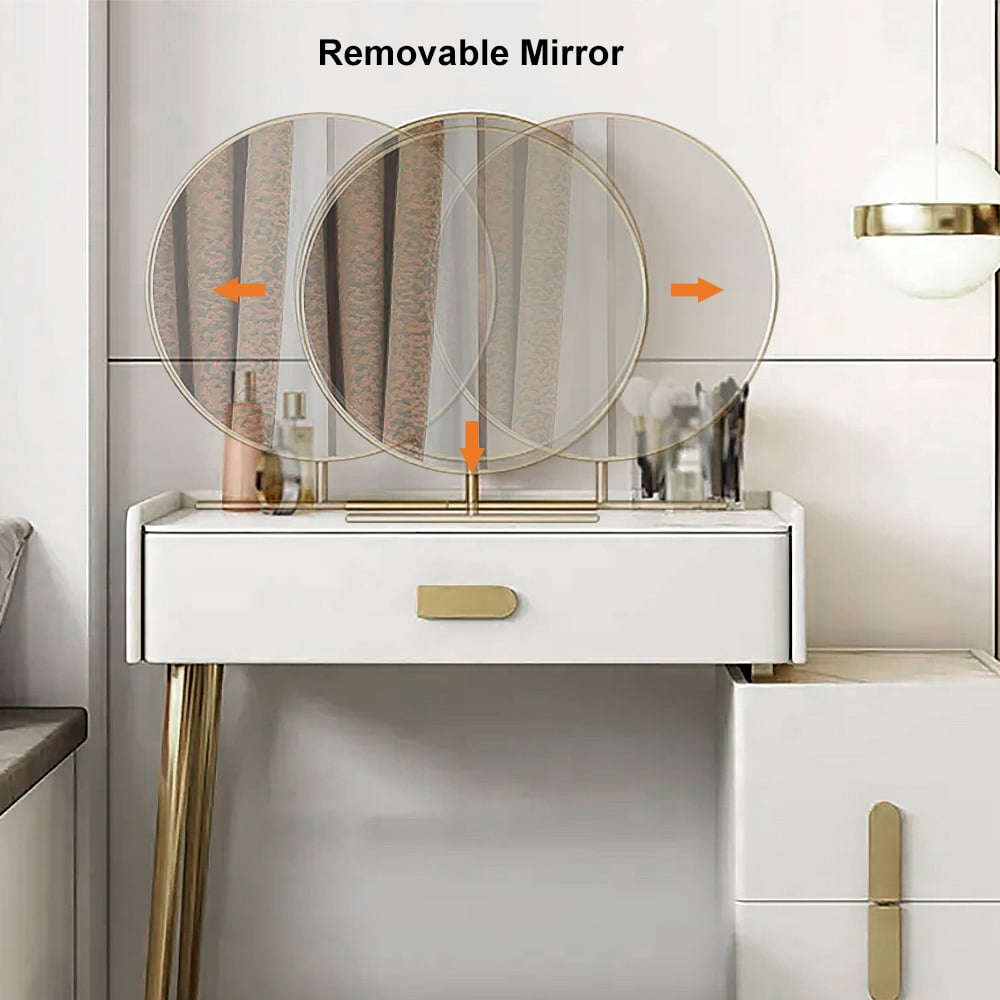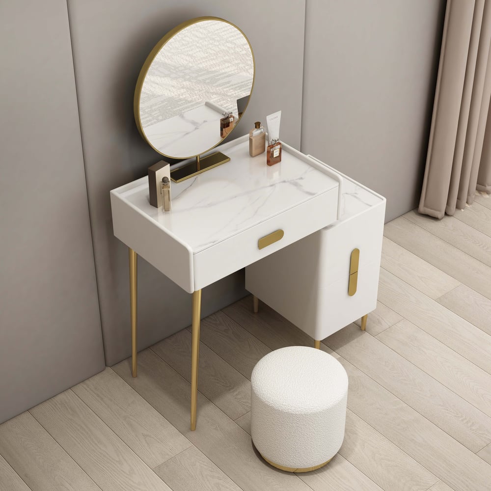 It’s time to organize your beauty items and other daily objects to get yourself a fresher feeling. With this vanity table, you’ll not only have much bigger storage space, but also you’ll gain a better mood when freshening yourself up to start a day with energy and a gorgeous look. Sintered Stone top with impressive marble texture is to add extra glamour to your furniture, matching well with your cosmetics, skincare products, etc. Altogether 3 drawers offer enough room for your things and keep them classified instead of a real mess. This vanity will be a decorative hit in your room.