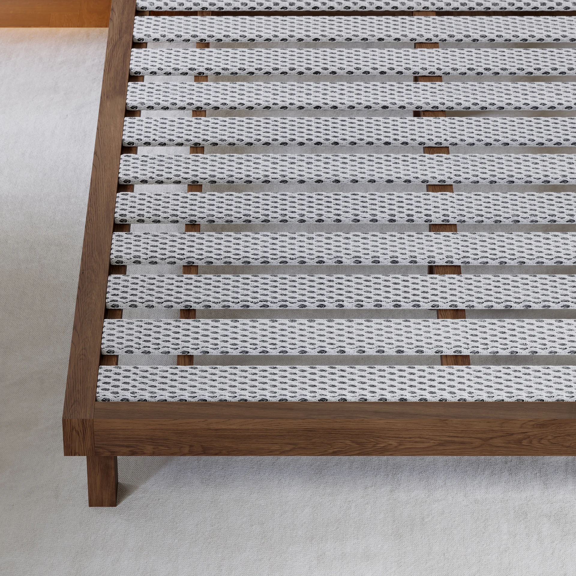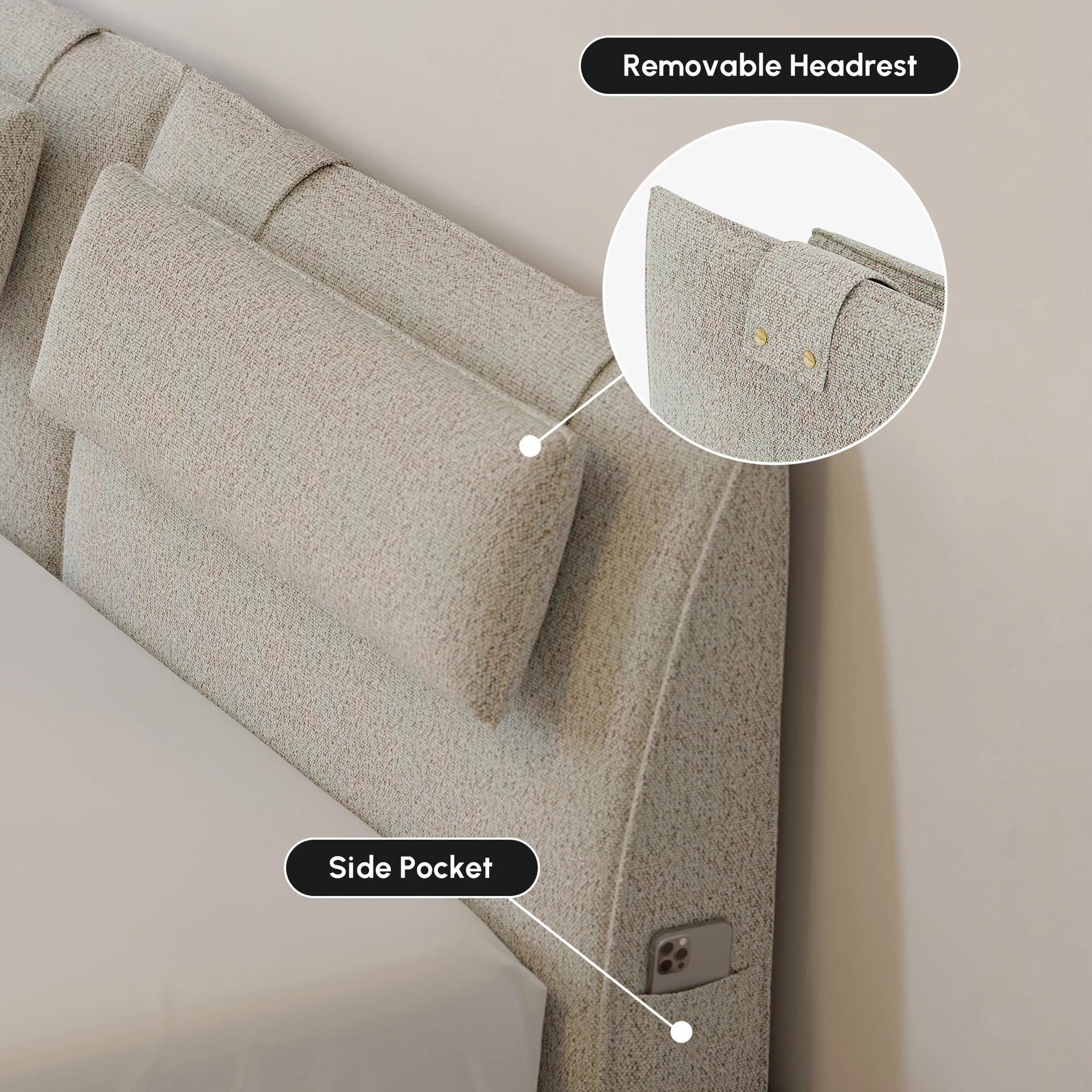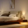 Experience modern convenience with this walnut bed featuring floating smart nightstands. Built-in LED lights, removable headboard pillows, side pockets, and roll-up slats combine style, comfort, and practicality.