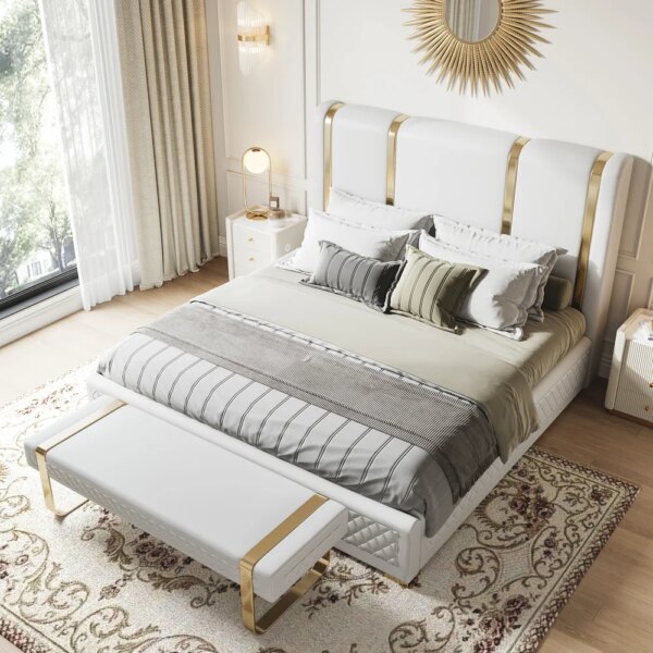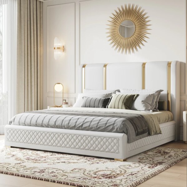 Add sparkle to your bedroom with this modern and light luxury bed. Built with a solid wood frame, it features low-profile side rails and some bed slats with encrypted solid wood. The eye-catching headboard is designed in an upright style that adapts to the reclining position to relieve neck pressure. Gilded and glazed stainless steel lines break the quiet monotony of the headboard. In addition, its foam padding provides extra cushioning for your head while you sleep or read. The sturdy and heavy metal feet provide weighty support without any worries.