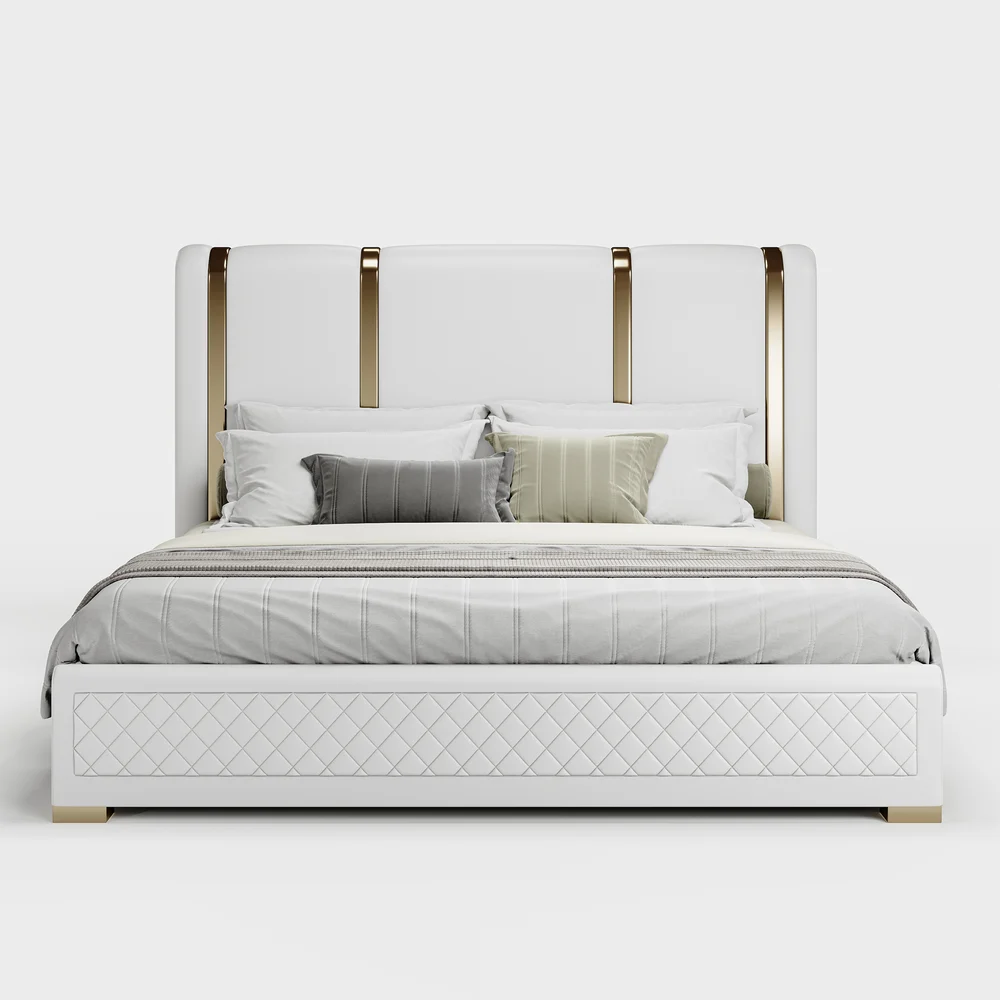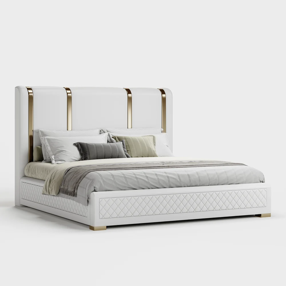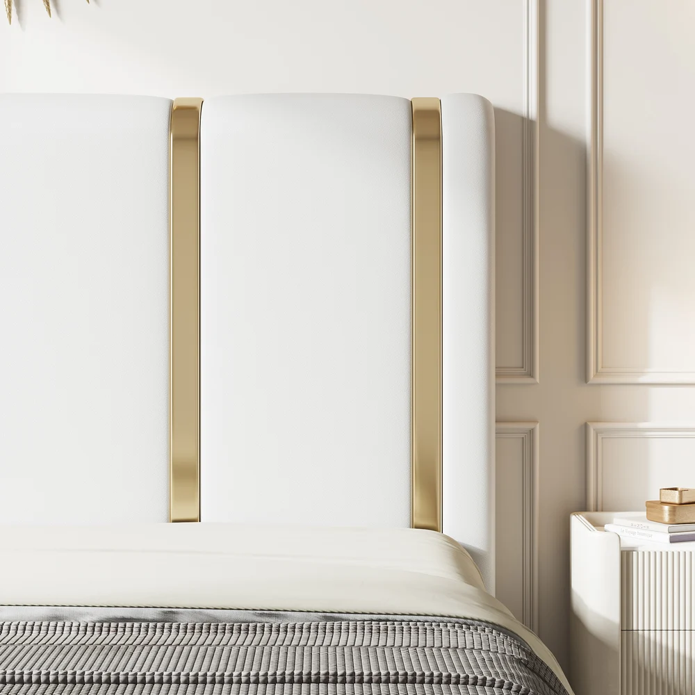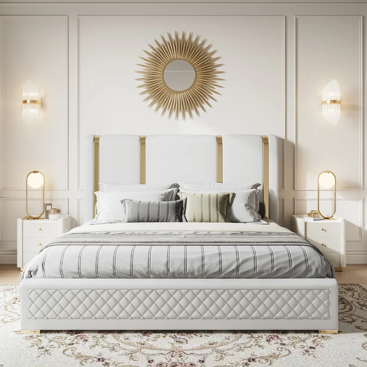 Add sparkle to your bedroom with this modern and light luxury bed. Built with a solid wood frame, it features low-profile side rails and some bed slats with encrypted solid wood. The eye-catching headboard is designed in an upright style that adapts to the reclining position to relieve neck pressure. Gilded and glazed stainless steel lines break the quiet monotony of the headboard. In addition, its foam padding provides extra cushioning for your head while you sleep or read. The sturdy and heavy metal feet provide weighty support without any worries.
