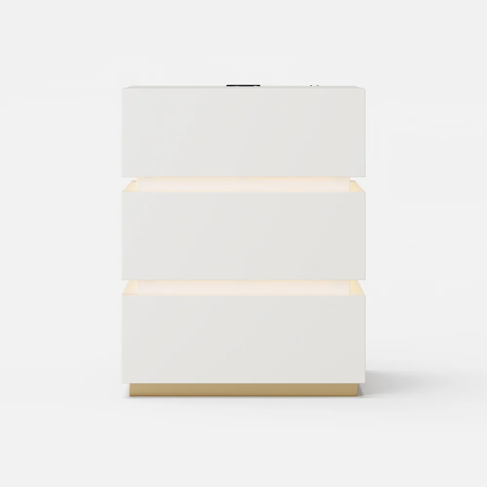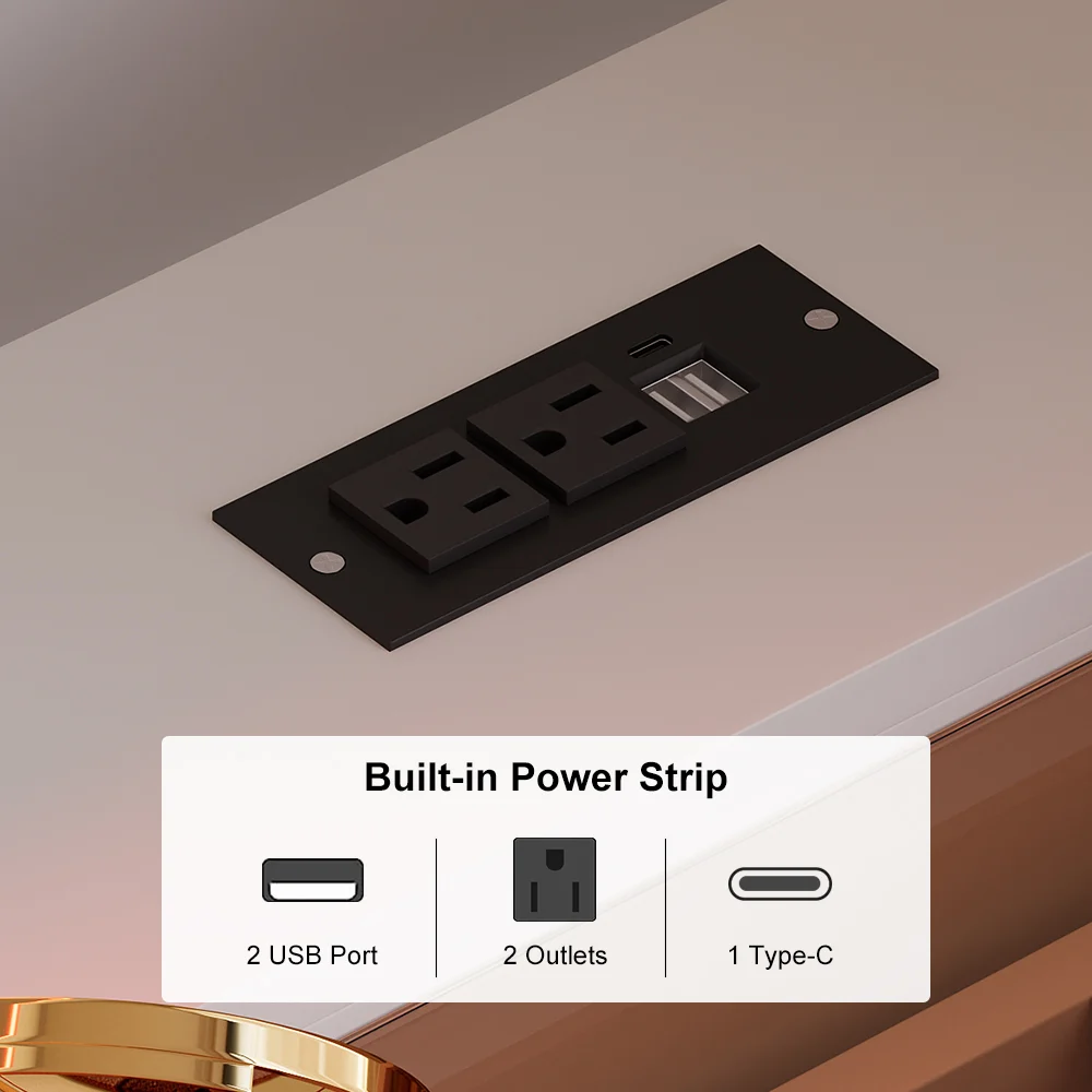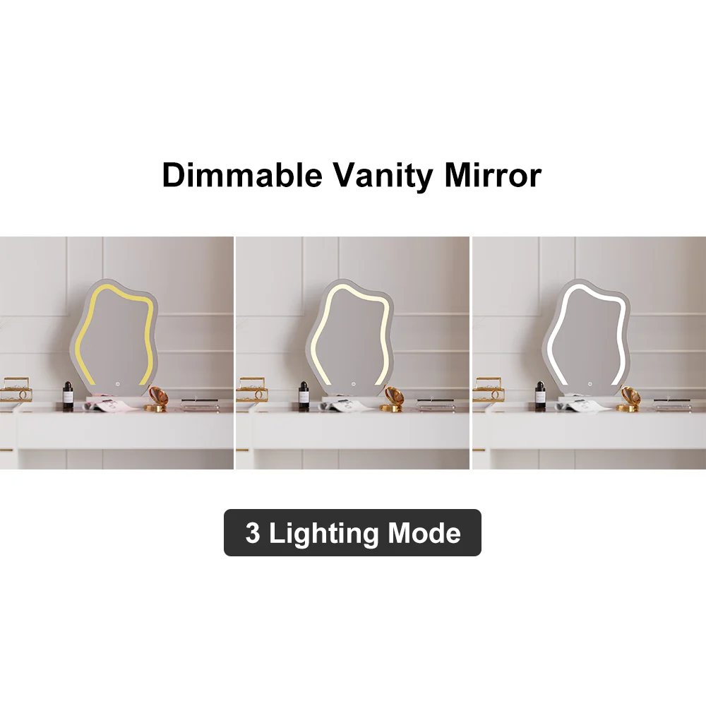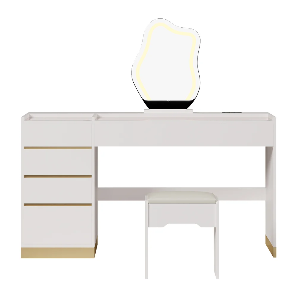 Elevate your beauty routine with our elegant makeup vanity set. Features include an adjustable lighted mirror with 3 modes, a durable tempered glass top, an integrated jewelry display, a side cabinet with a transparent top, and a multi-charging station with 1 USB port and 2 outlets