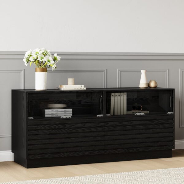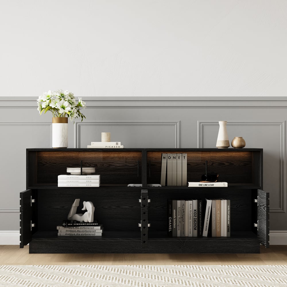 Spacious storage includes both open and concealed compartments for media components and accessories.
