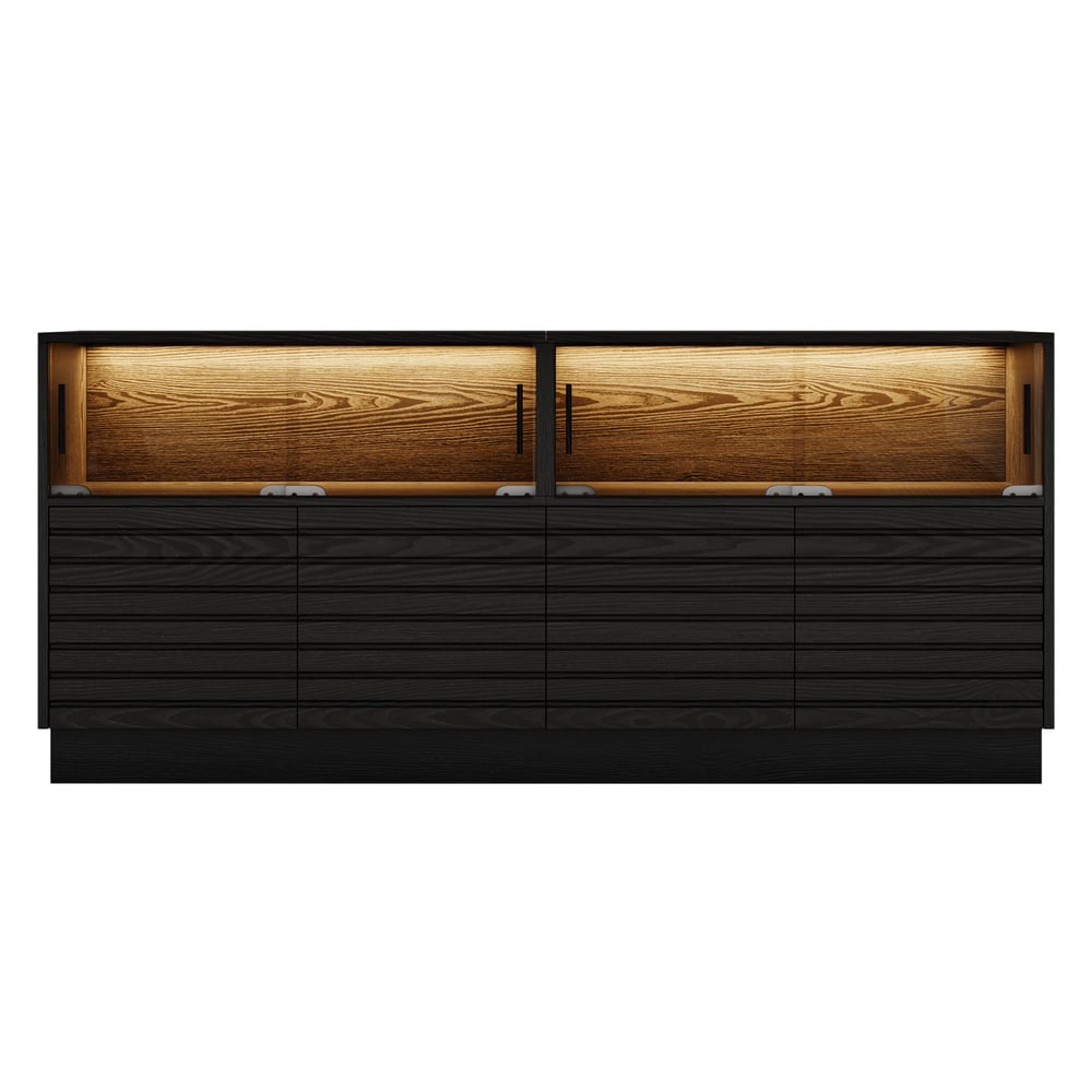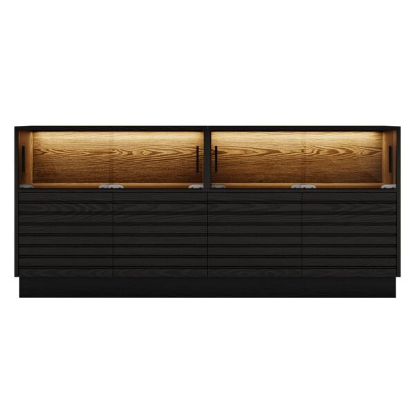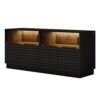 This modern black TV stand features integrated LED lighting and sleek acrylic panels, creating a striking visual centerpiece for contemporary spaces. Its spacious design combines ambient illumination with functional organization.