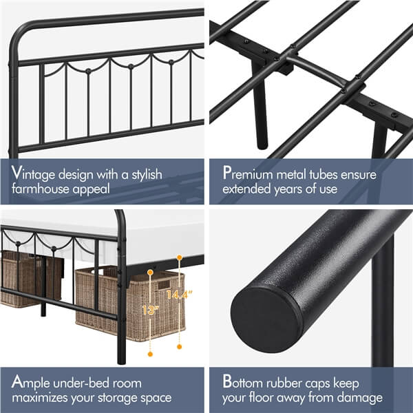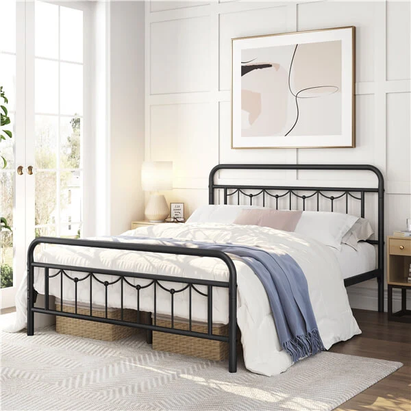 • Classic Farmhouse Sensibility: This bed frame showcases an adorned silhouette, graceful downward arches and thick tube framework for a farmhouse appeal. The exquisite design on the headboard and footboard is reminiscent of traditional swag valances, which balances the coolness of metal while adding a romantic flair.