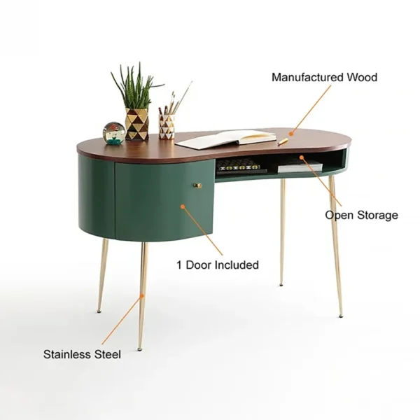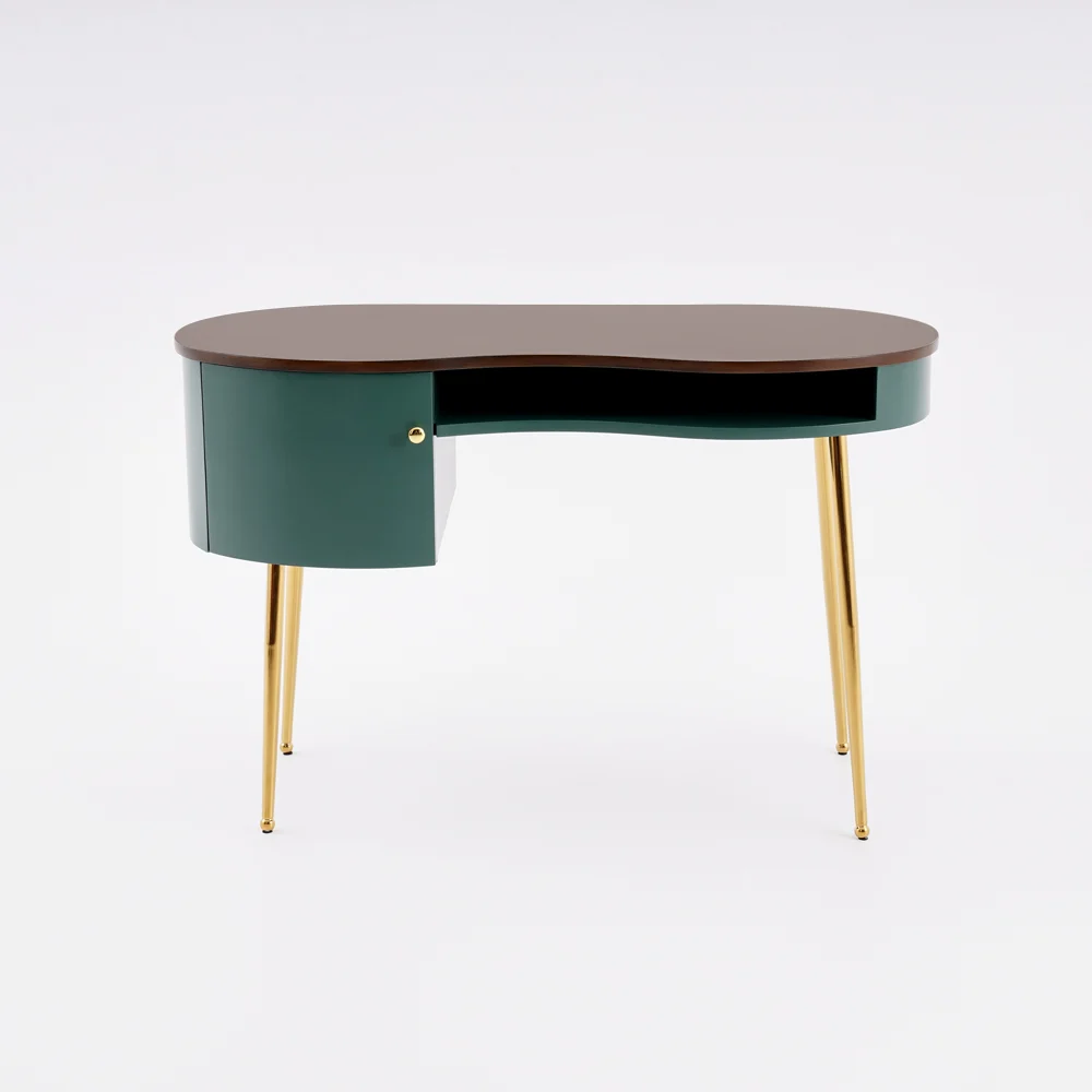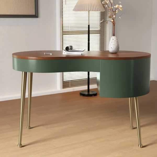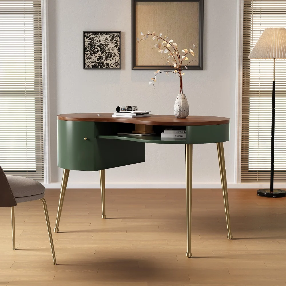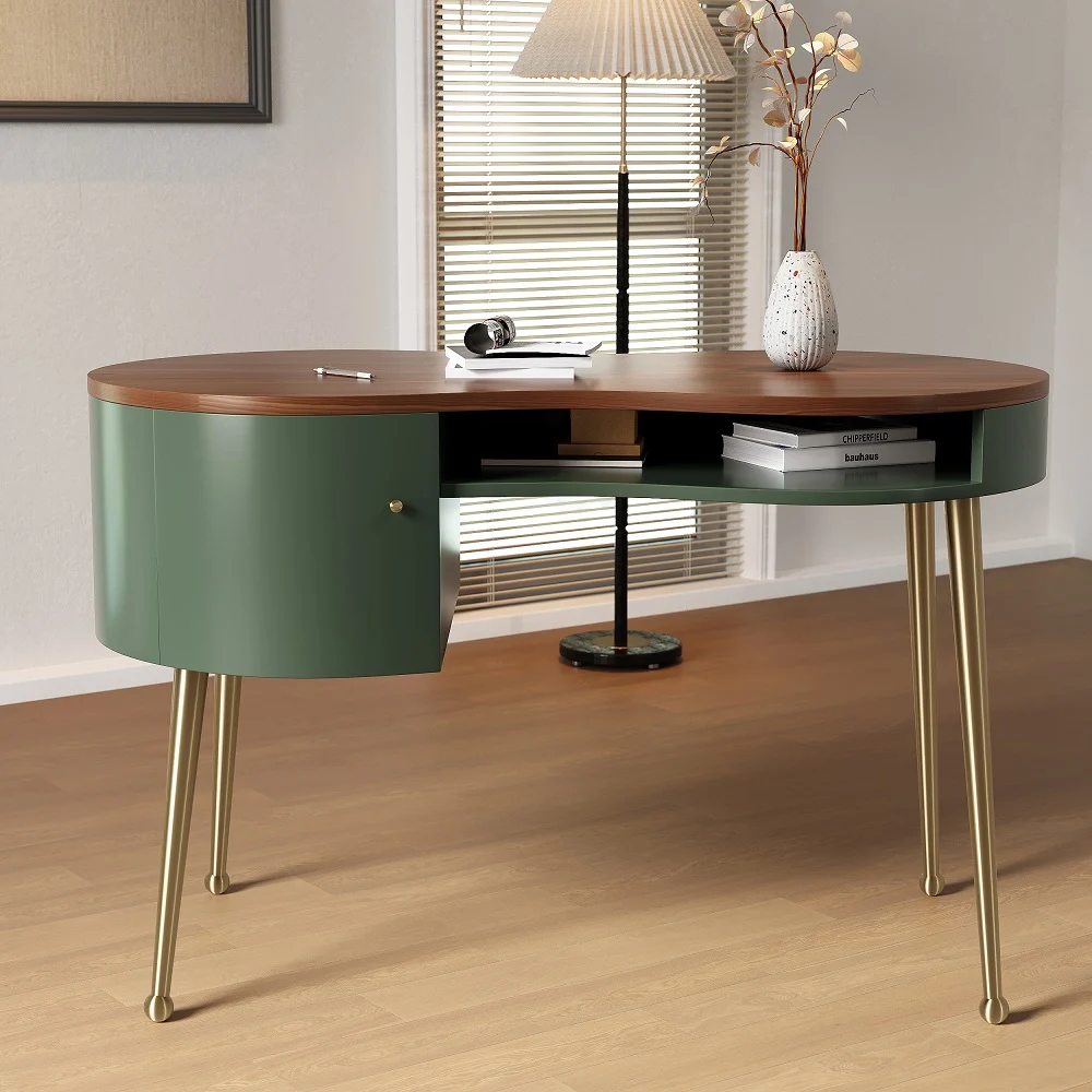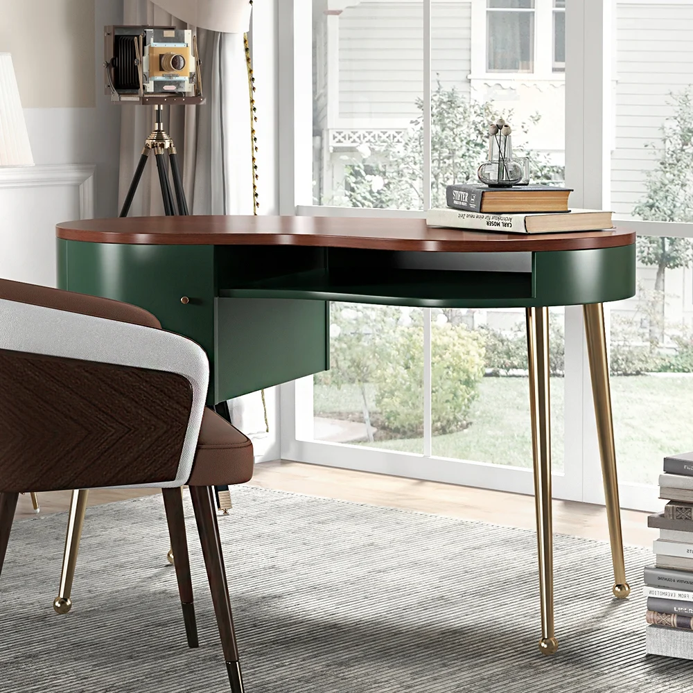 Featuring a mid-century modern design with golden accents, this exquisite office desk must be an eye-catching masterpiece in your room. The spacious desktop provides a large space for your books and decorations, while the open shelf and cabinet design offer a hidden place for organizing your essentials.