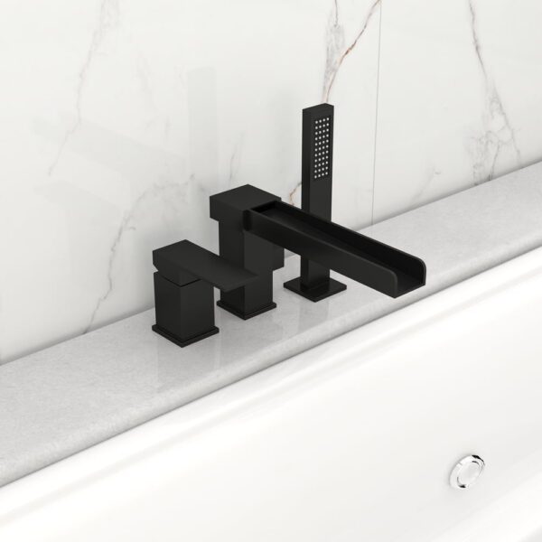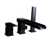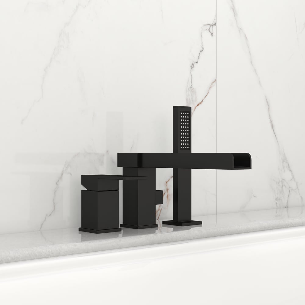 Featured in simple style and elegant waterfall design, the Mero Faucet Collection in solid brass construction will demonstrate your exquisite taste and aesthetics. This Mero roman tub faucet is the best choice for a bathroom makeover. This handsome design comes with an open trough-shape spout, a lever handle and an easy-to-handle handheld shower. It makes a beautiful waterfall statement or delivers focused spray to offer enjoyable sensation on your skin. The bold matte black finish completes the look and fits into any contemporary bathroom.