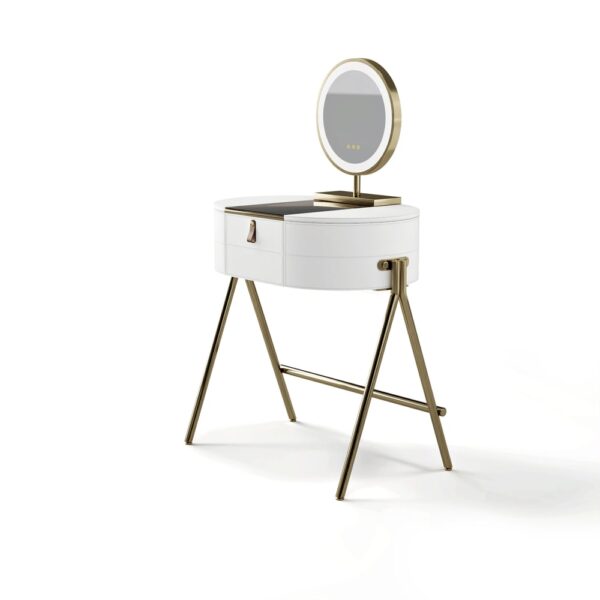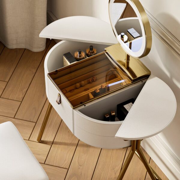 Smooth-opening side panels with magnetic closure reveal hidden storage for perfumes and skincare.