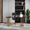 Clean proportions are complemented by the antique dark tabletop, which contrasts well with the metal in gold. It’s a good idea to invest in a trendy writing desk for your home office when working. You can’t go wrong with a desk with a dark and gold surface with gold scrolling frame legs. This desk provides a basic but sophisticated workstation for the modern workplace with a dark wood veneer and golden square legs. Wood and metal construction provide long-term durability and attractiveness. To add a dash of modern refinement and flair to your work environment, go purchasing. The use of solid wood and metal assures that the product will persist for a lot longer. A delicate gold frame with a distinctive form adds a modern, elegant touch to the design and it will stand for years to come.
