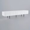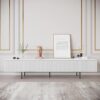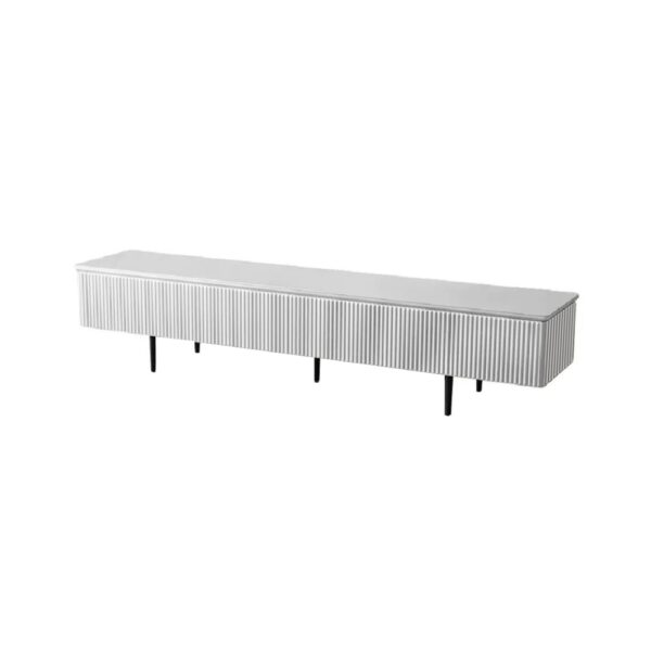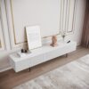 This is modern that covers solid wood with 4 black metal legs. This modern TV stand with 2 drawers boasts a longitudinal structure with wood drawers which are modern designs because of the white and natural color combination. Rounding off the design, it is created from high-quality solid + manufactured wood and metal, which gives solid support and promises long-term usage.