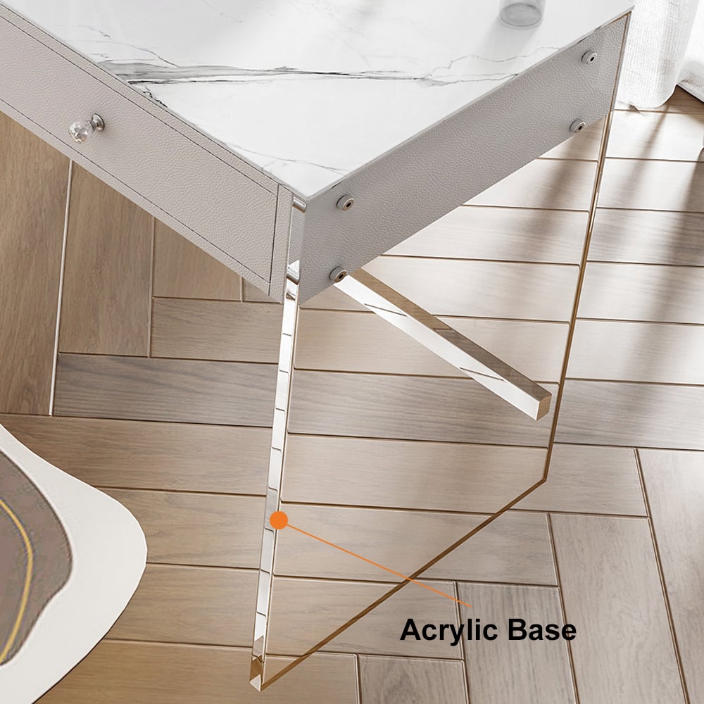 Get ready in style with this acrylic makeup vanity. Features 2 pull-out drawers that slide effortlessly along sustainable glides, allowing you easy access to your makeup and accessories, while the lighting vanity mirror that allows rotating 360°, ensures you’ll be ready for your close-up at any angle. Complete with a vanity stool upholstered in the same design, this vanity is the perfect place to primp and prep for the day ahead!