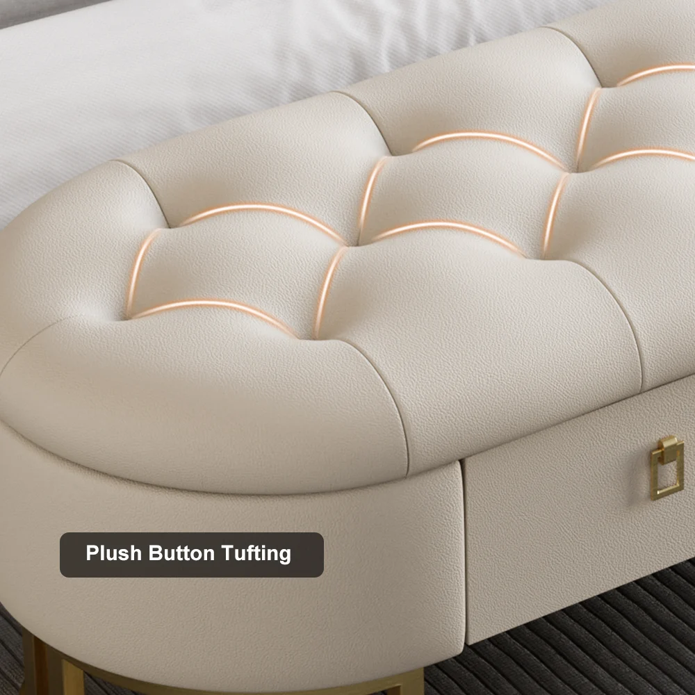 This stunning upholstered bedroom bench is crafted with both style and practicality in mind, this versatile piece features a luxurious leather upholstery that exudes sophistication and elegance. It also boasts two spacious drawers of storage, providing ample space to stow away everything from extra linens to clothing.
