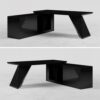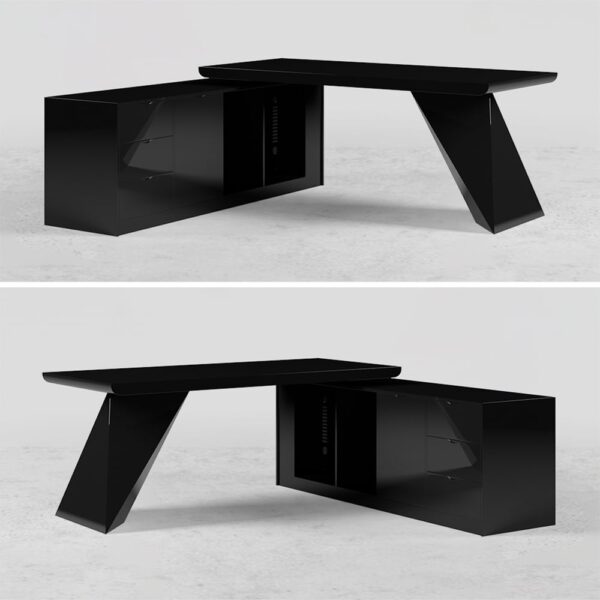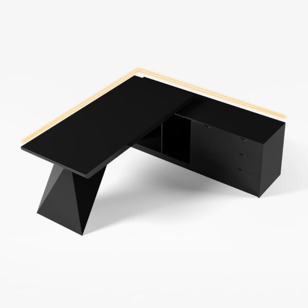 A modern black L-shaped executive desk with ample storage, paired with a supportive faux leather office chair. Designed for efficient corner use, this set combines a spacious work surface, organized storage, and comfortable seating for a productive home office.