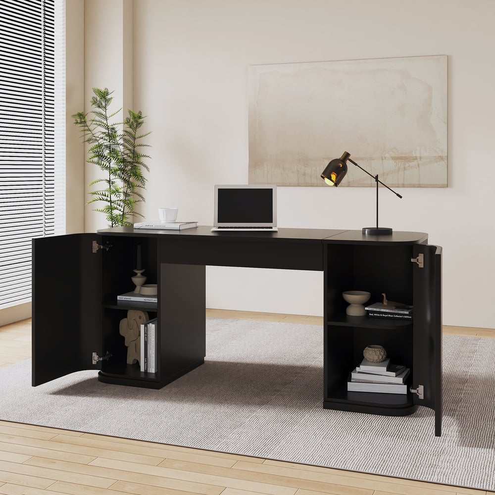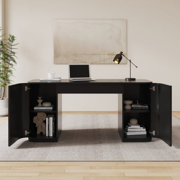 【Spacious & Smart Storage】 Four cabinets and hidden compartments keep books, files, and decor neatly organized, maximizing workspace efficiency.