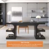 Upgrade your home office with this 64.2″ modern black writing desk. Made of durable engineered wood (MDF), it resists warping, cracking, and swelling from humidity/temperature changes. The wide rectangular desktop has ample space for laptops, monitors, writing, or studying. 1 drawer and 4 open shelves store office supplies, books, and gear to keep your workspace tidy.