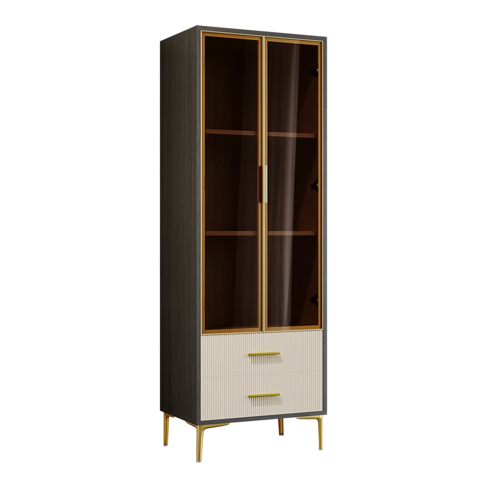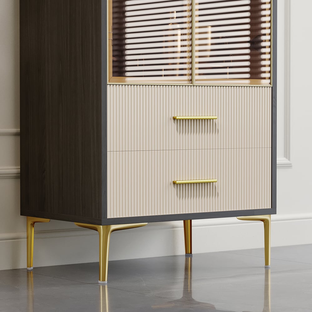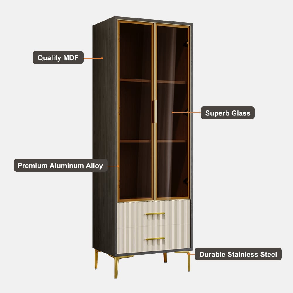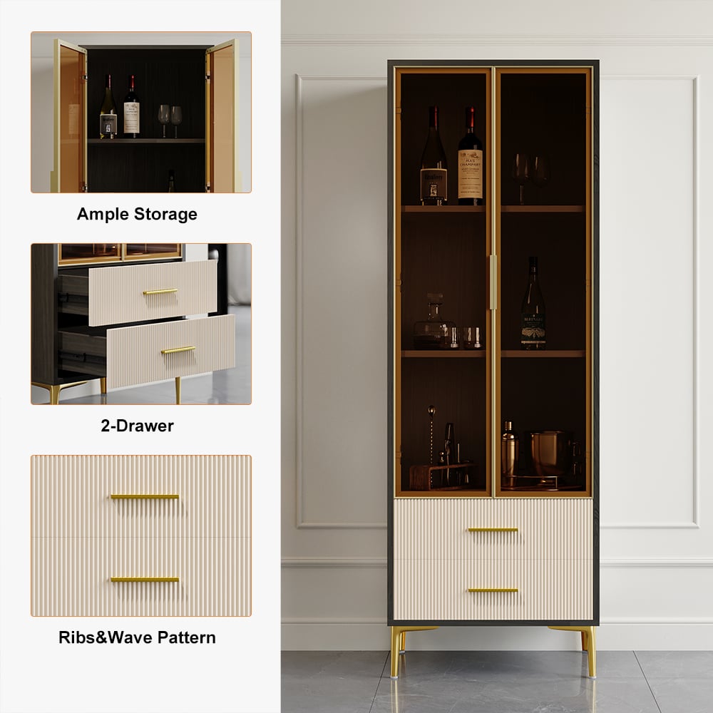 Add flair to your living space with this modern bar cabinet. It provides a contrast in color that gives a mannered vibe to refresh your interior decor. Glass doors allow you to display your wine bottles and collections. Two-drawer is included to allow extra space for versatile and practical use. Constructed from quality MDF and durable stainless steel, it ensures sturdy support and stability for a timeless look and beauty.