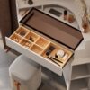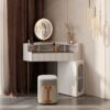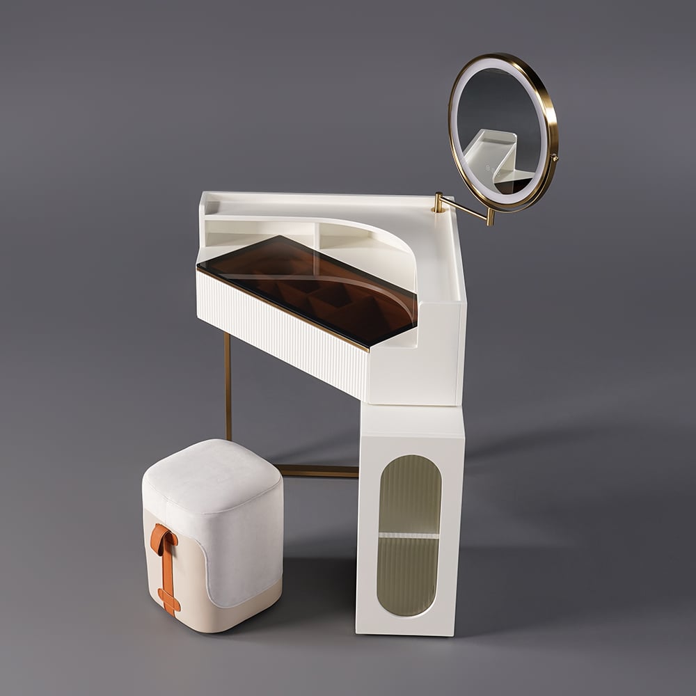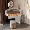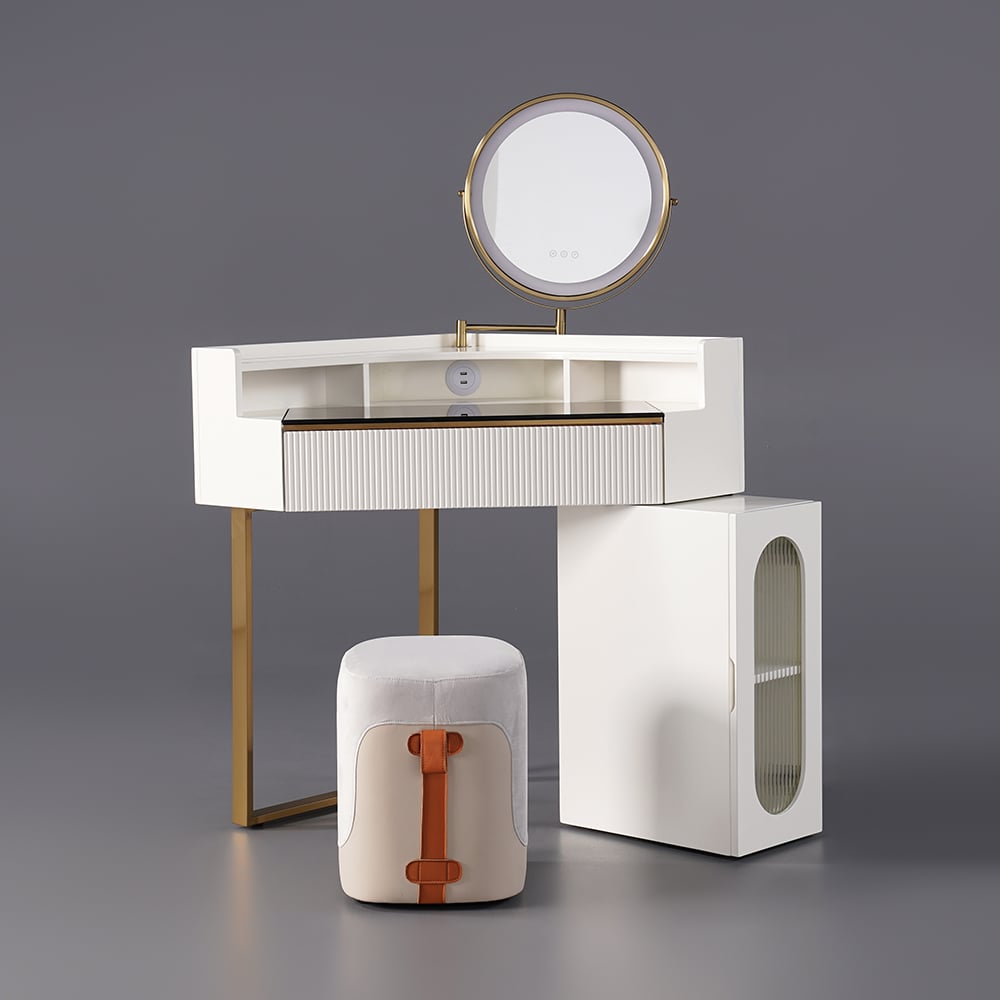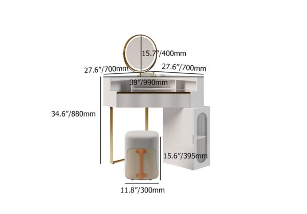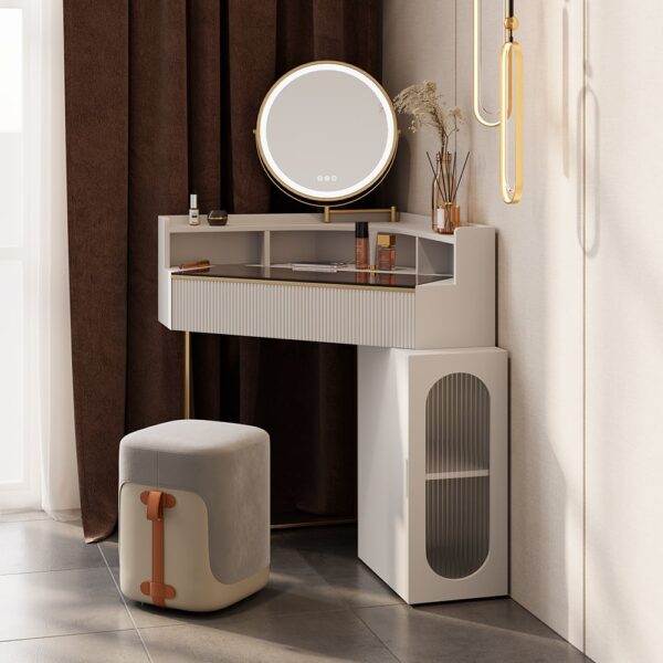 This corner makeup vanity with a standing mirror & cabinet delivers all the features you need to get your daily makeup done. Whether you use it for your morning preparations or afternoon errands, it offers just the right amount of storage and tabletop space. Features with acrylic top to cradle and show your accessories. The perfect place to primp and prep for the day ahead!