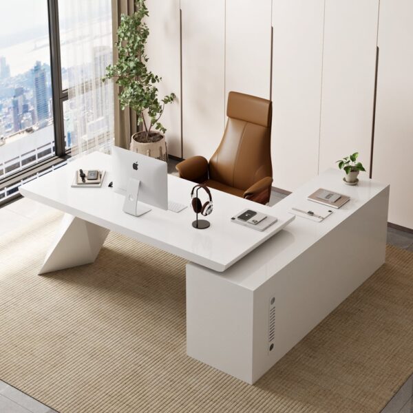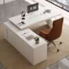 A modern white L-shaped executive desk and genuine leather office chair set. Designed for multitasking efficiency, this set combines ample storage, an integrated chair footrest, and a clean aesthetic for a sophisticated and ergonomic workspace.