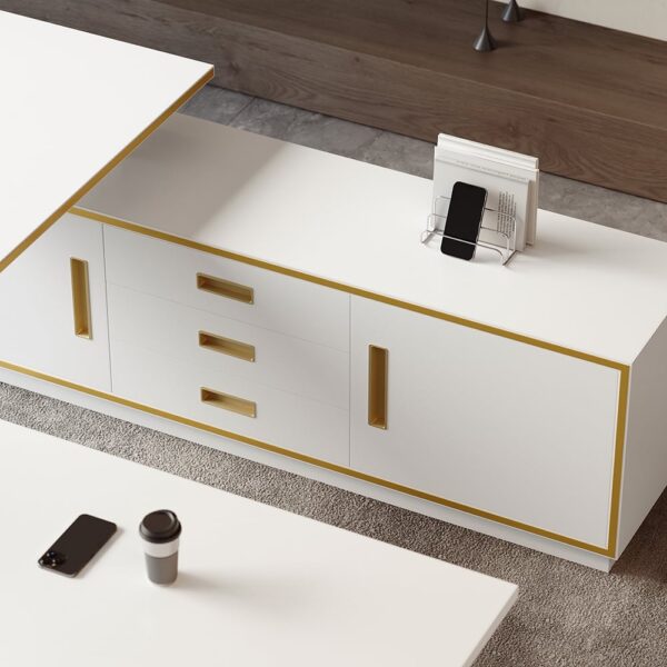 Professional Storage System: Two full-size cabinets and three drawers securely organize files, supplies, and equipment.