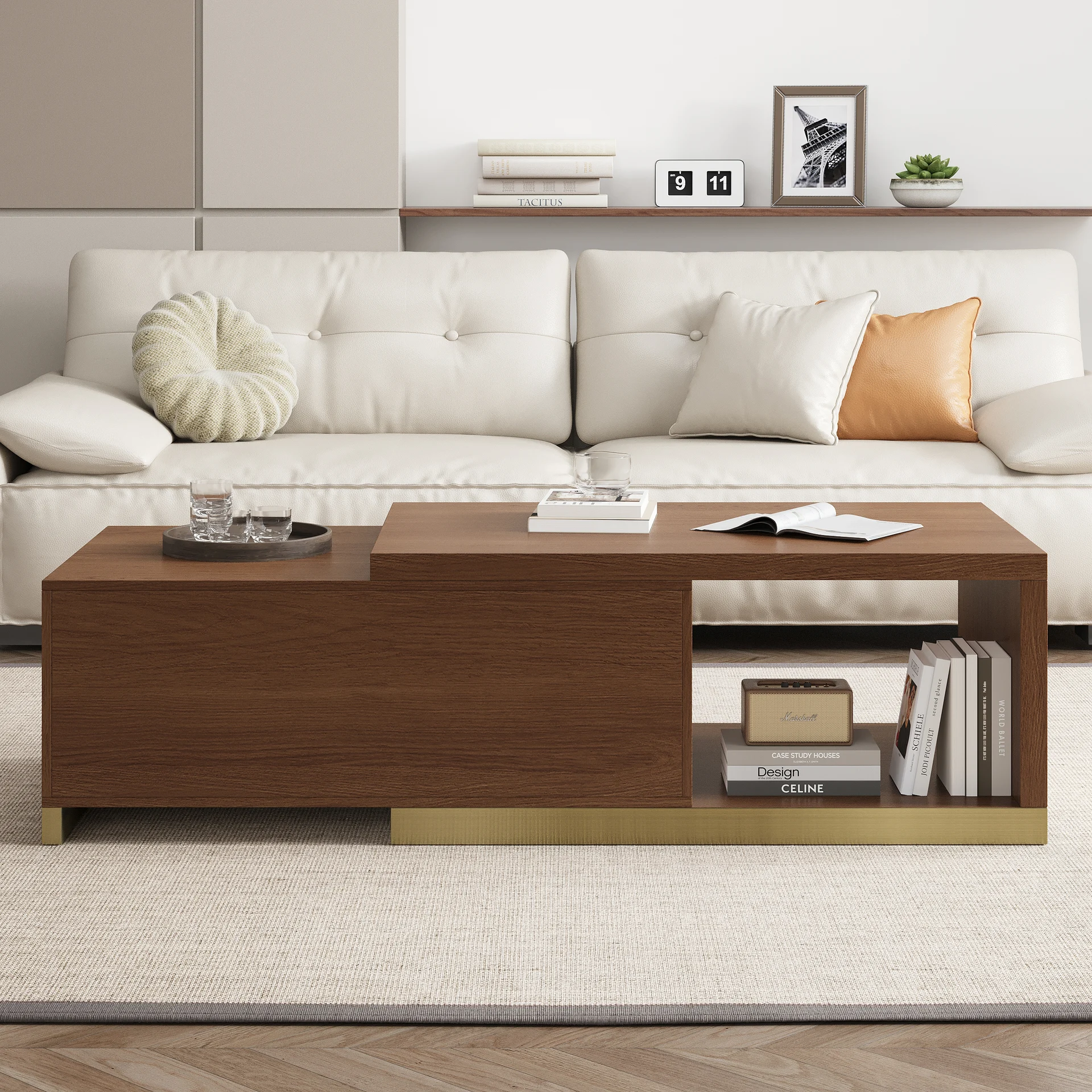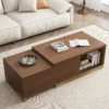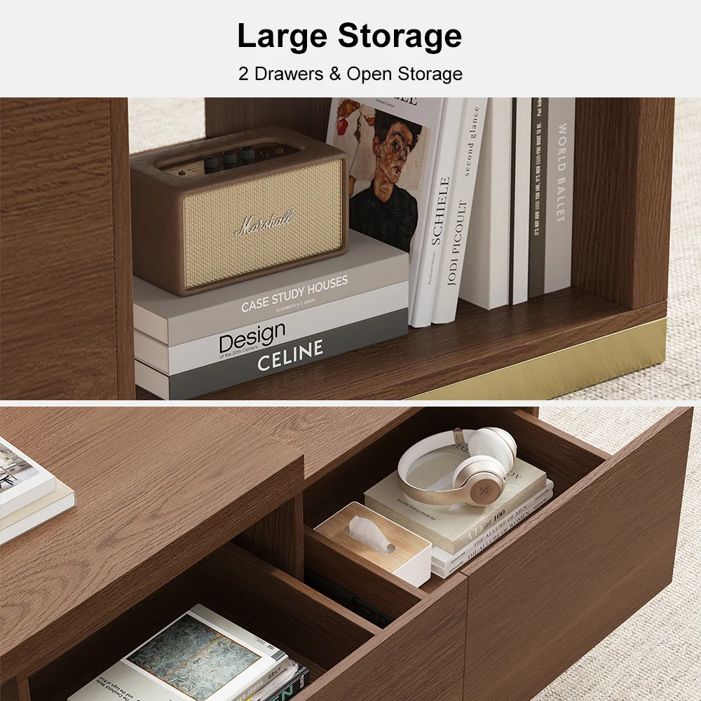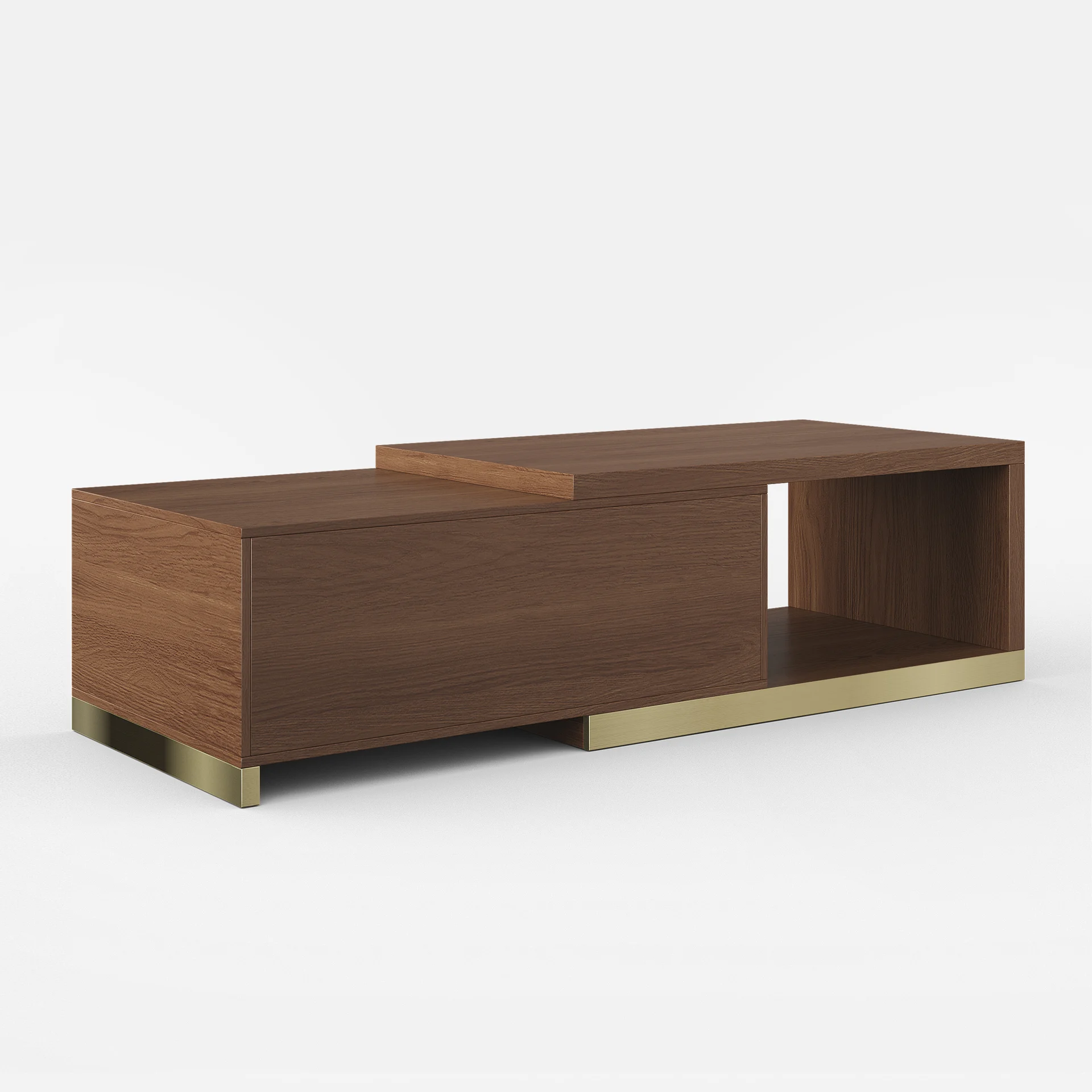 This modern rectangular coffee table features a walnut finish and an extendable design for versatile use With two spacious drawers, it provides ample storage for essentials Its sleek, minimalist style enhances any contemporary living room with functionality and elegance