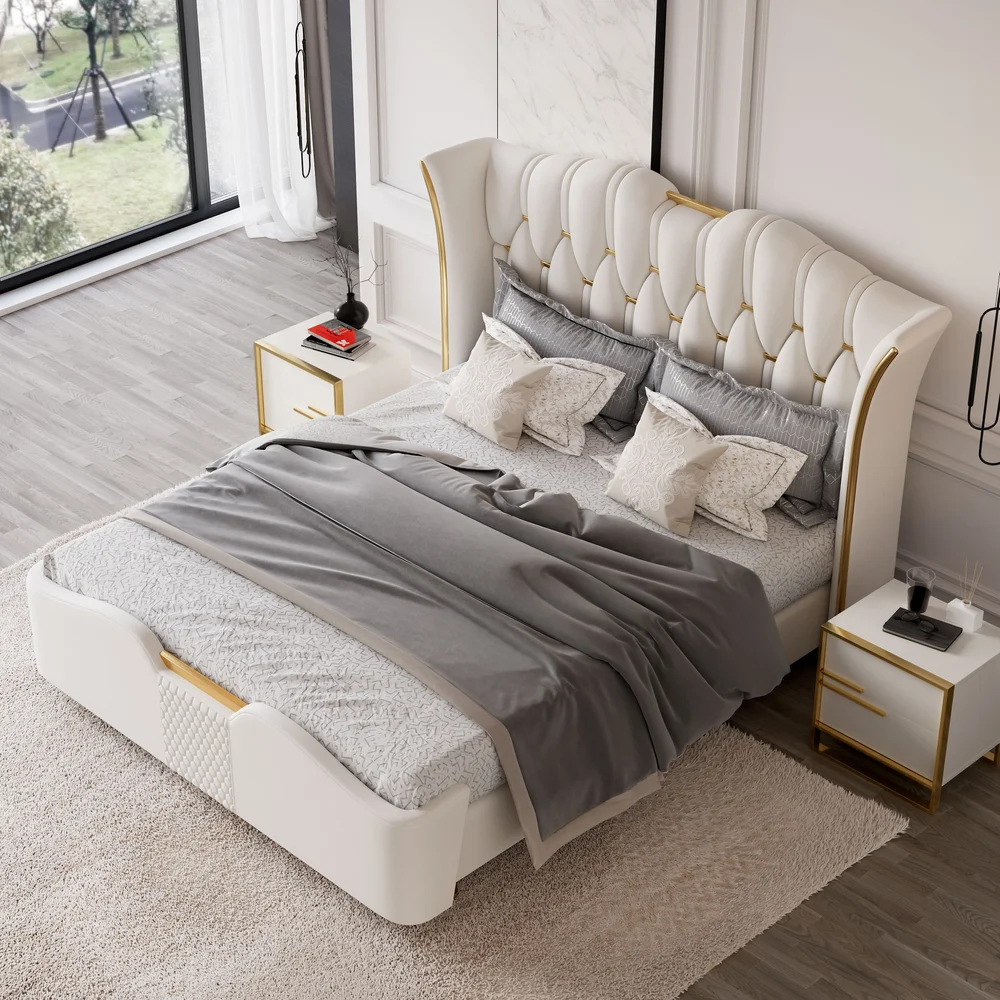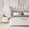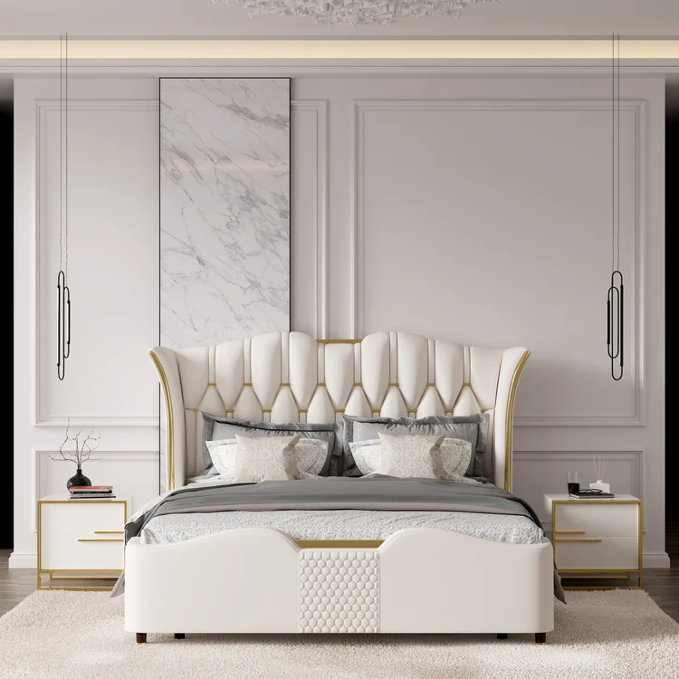 This luxurious king-size bed upholstered in leath-aire material, is completed by a sophisticated tufted wing-back headboard that adds comfort and style. With its sleek modern design and strong build, the bed serves as an exquisite centerpiece for any bedroom. It combines elegance and practicality for a restful night’s sleep.