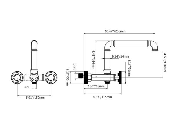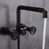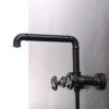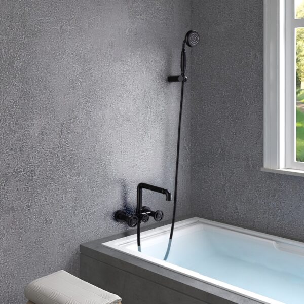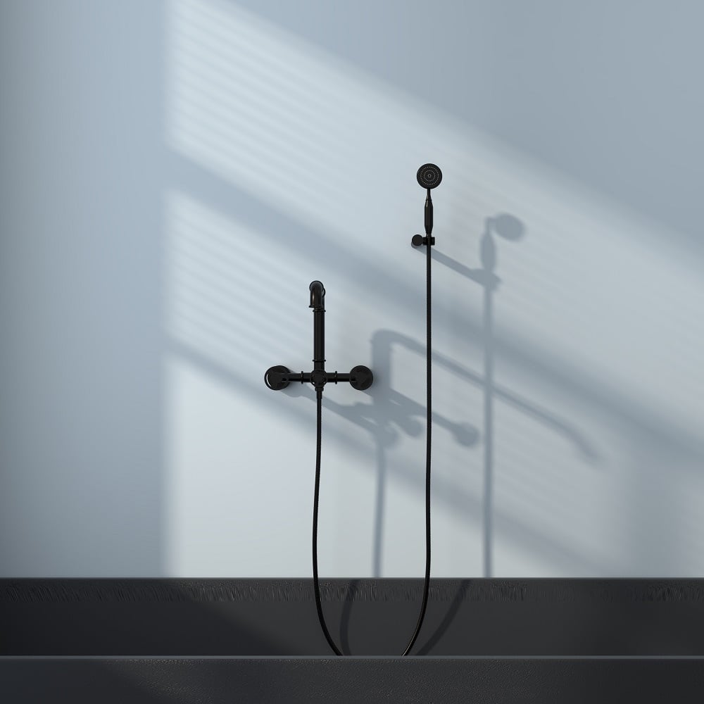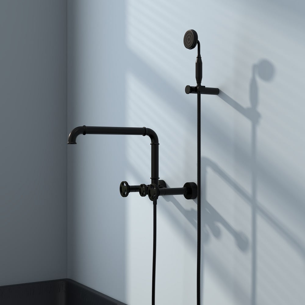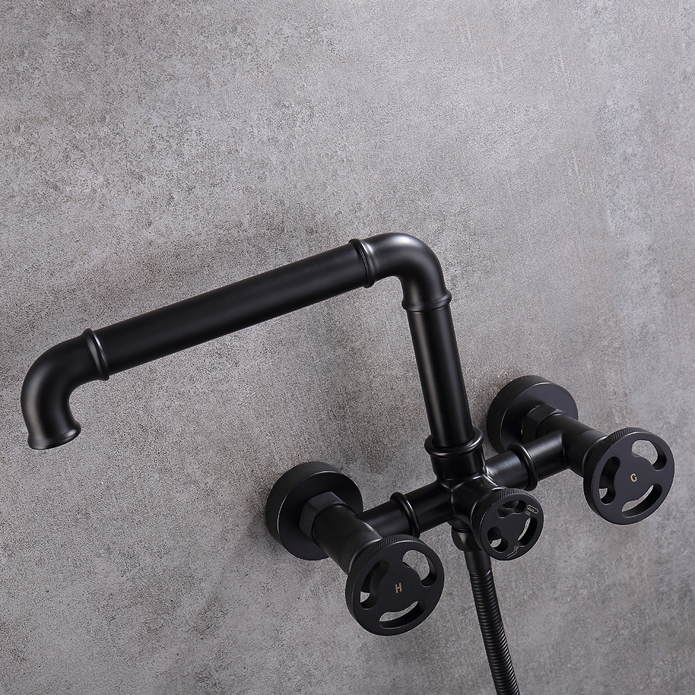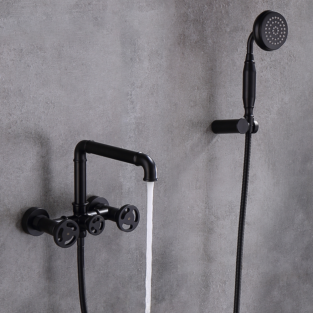 Featuring a design inspired by industrial steam pipes, this Ruth Faucet Collection has a distinct style that fits well in the urban-styled and modern home decor. From Ruth Collection comes the industrial matte black wall-mount bathtub faucet to enhance your bathing time. The pipe design along with wheel handle adds plenty of industrial fun and flair. The 2 side wheel handles are easy to control the temperature and flow while the central one divert water from filler spout to hand spray. Upgrade your bathroom decor with this handsome bathtub faucet.