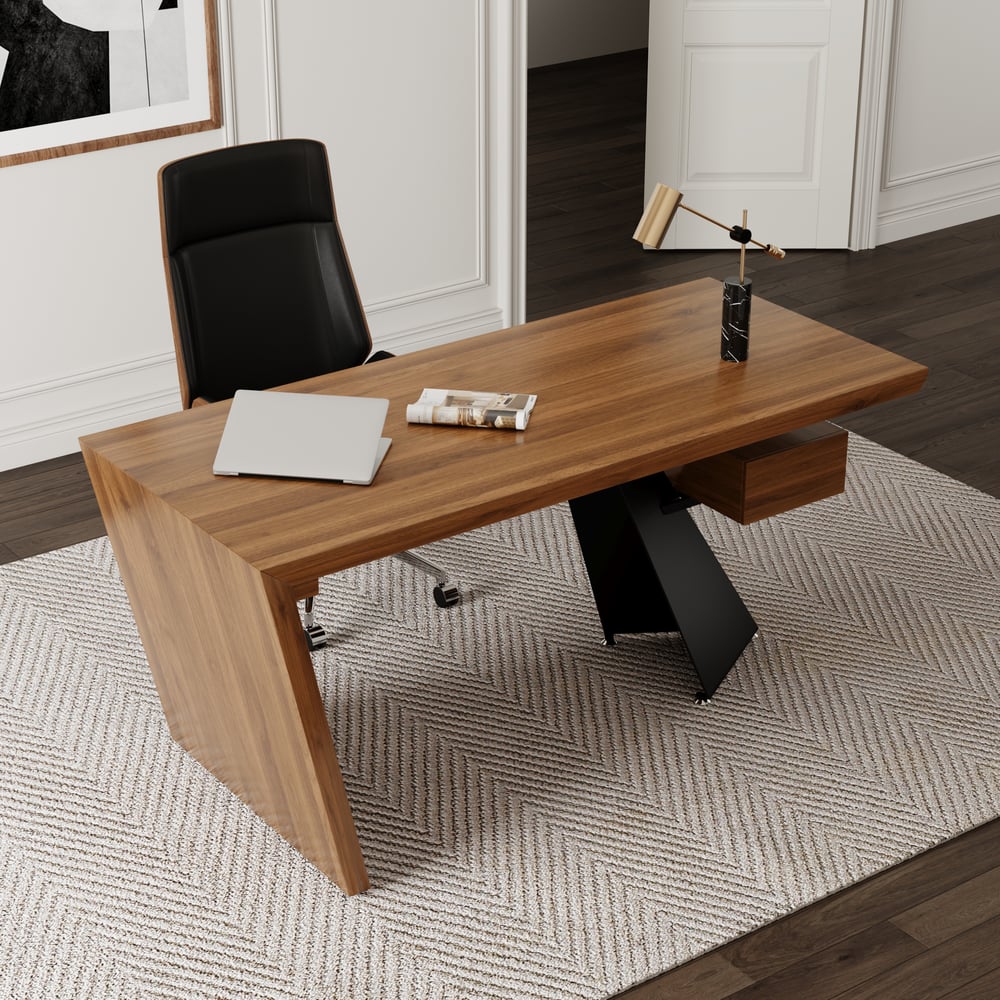 Elevate your workspace with this industrial-style desk and chair set. Featuring a solid pine wood top with a distressed finish, a floating drawer, and an architectural metal base, paired with a wide-seat faux leather executive chair for a blend of raw character and modern comfort.