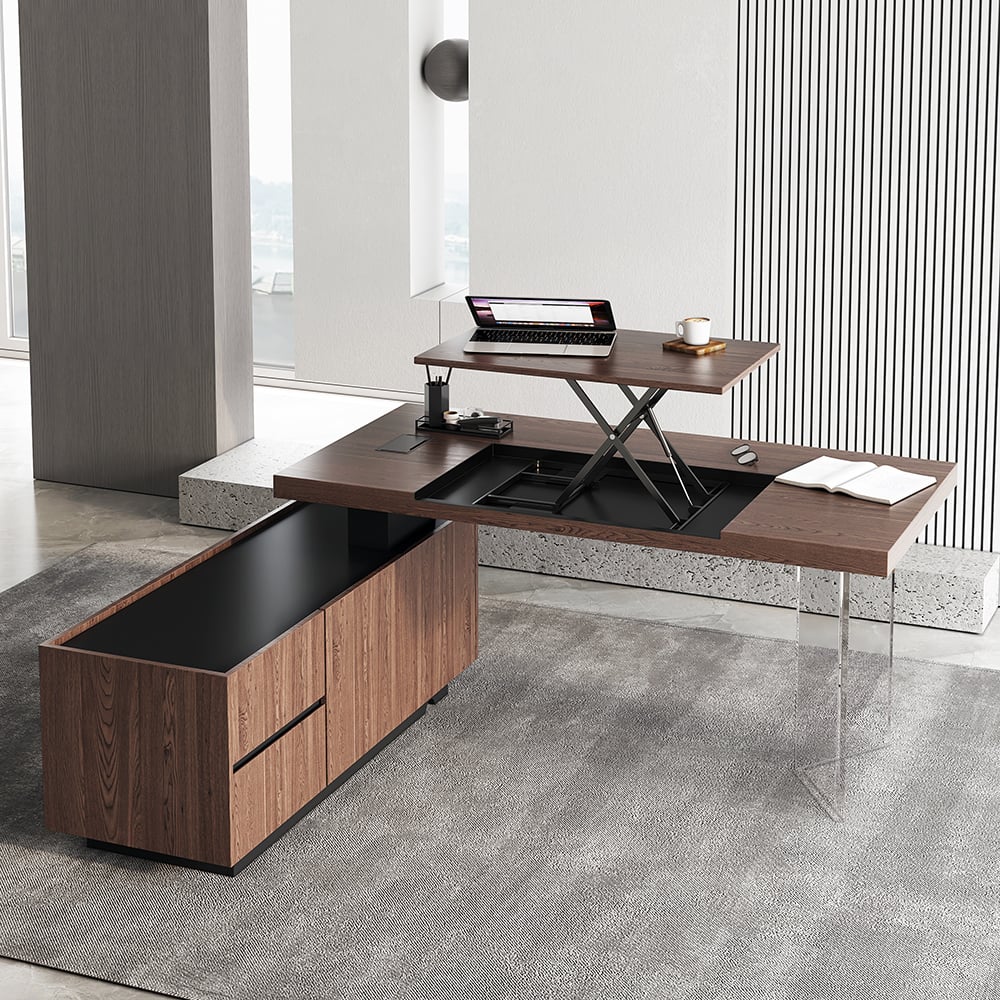 Transform your workday with this modern walnut L-shaped standing desk and leather office chair set. The desk features an integrated sit-stand lift mechanism and chunky side storage, paired with a supportive high-back chair for a complete, health-conscious home office solution.