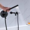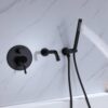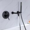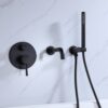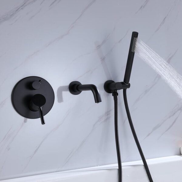 Sleek and minimalist, this modern wall mount bathtub filler faucet could be an outstanding piece to deliver a complete and fabulous shower experience. Featuring a swiveling spout with curved details, it swirls 360° for greater reach and convenience, functional and stylish. Hand shower with extra long stainless steel hose offers targeted cleaning during a bath. Plus, paired with one handle, it controls water temperature and flows effortlessly while the round knob diverts water from the tub spout to hand shower. Made from premium solid brass in matte black for corrosion resistance, this tub filler allows for long-term durability, easy to maintain. Enjoy a luxurious bath with this handsome bathtub filler faucet!