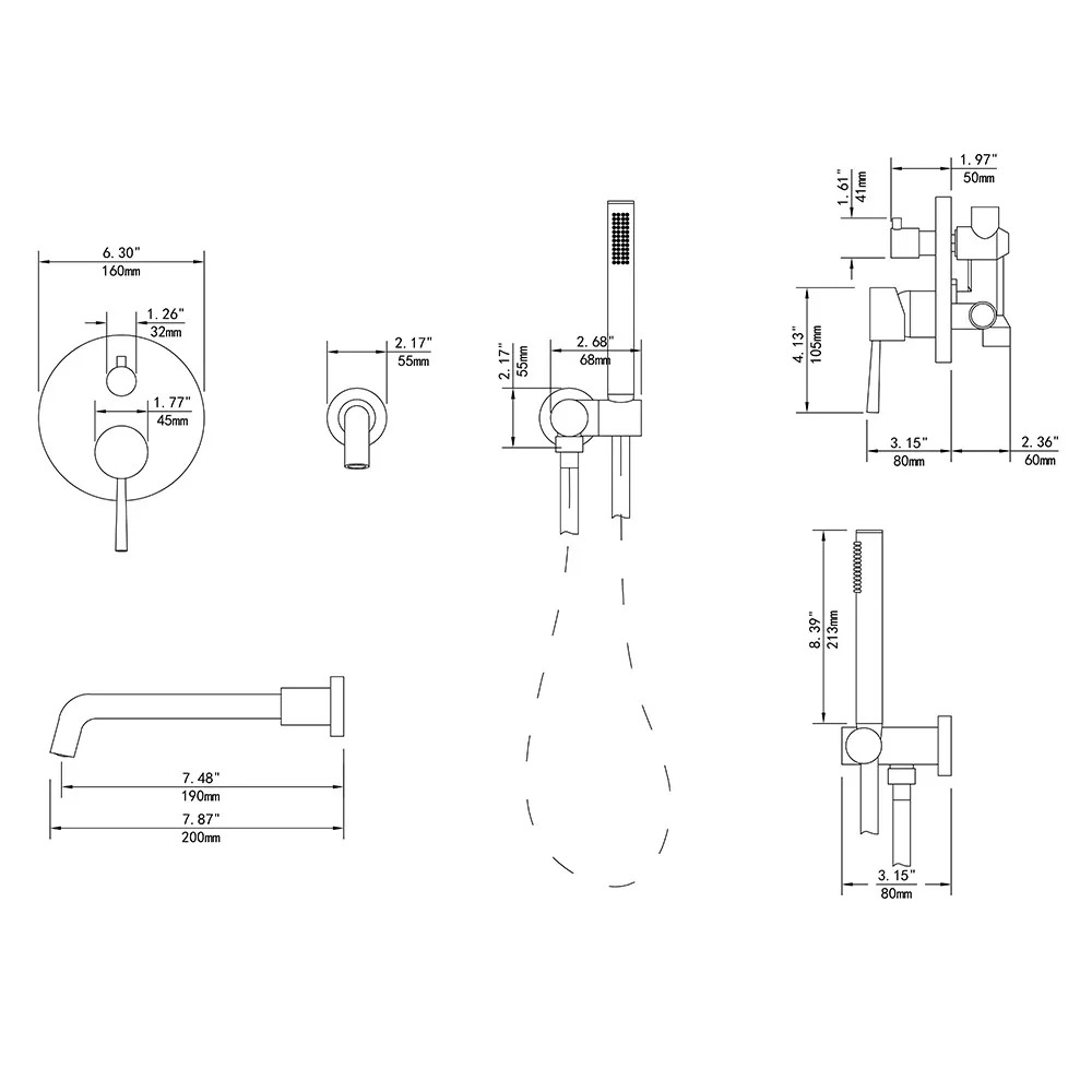 Included ComponentsHand Shower, Faucet Spout, Handshower Holder, Mounting Hardware, Shower Hose, Rough-in Valve & Trims