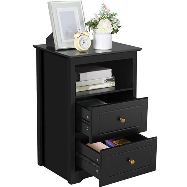 Tall Nightstand with 2 Drawer and 1 Cubby, Wooden Side Table with Storage Drawers and Open Shelf for Bedroom, Living Room, Office, Black