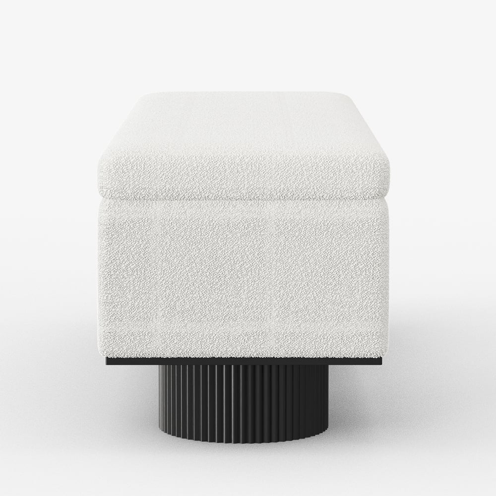 Add style and functionality to your entryway with this elegant boucle bench. Upholstered in cozy boucle fabric, it brings a soft and inviting texture to any space. The unique fluted cylindrical legs, crafted from solid wood with a grooved finish, add a modern sculptural element. Perfect for use as a shoe bench or accent seating, this piece combines contemporary aesthetics with durability. Whether placed in the entryway, living room, or bedroom, it creates a warm and sophisticated ambiance.