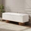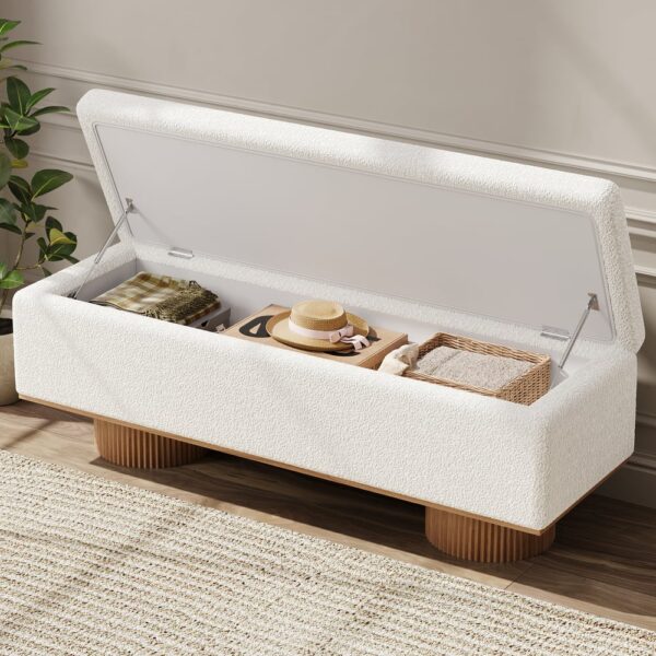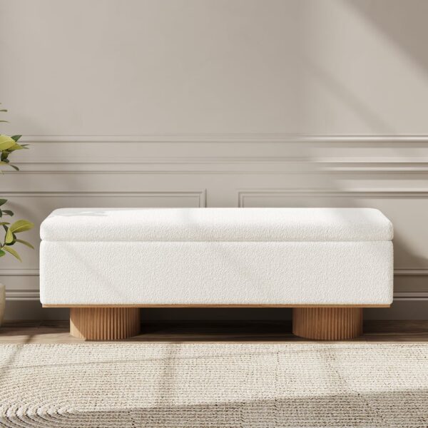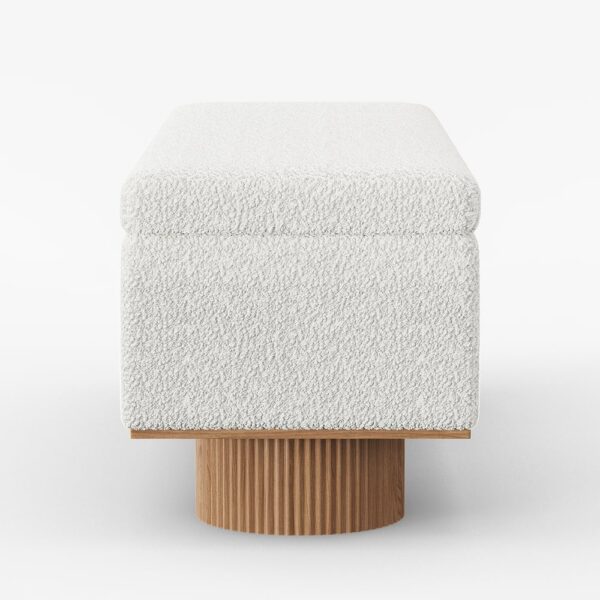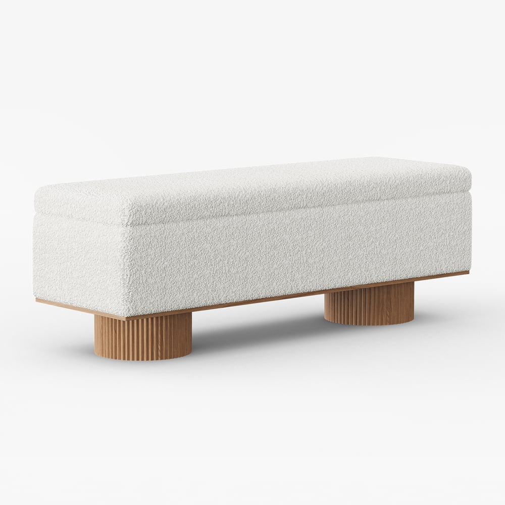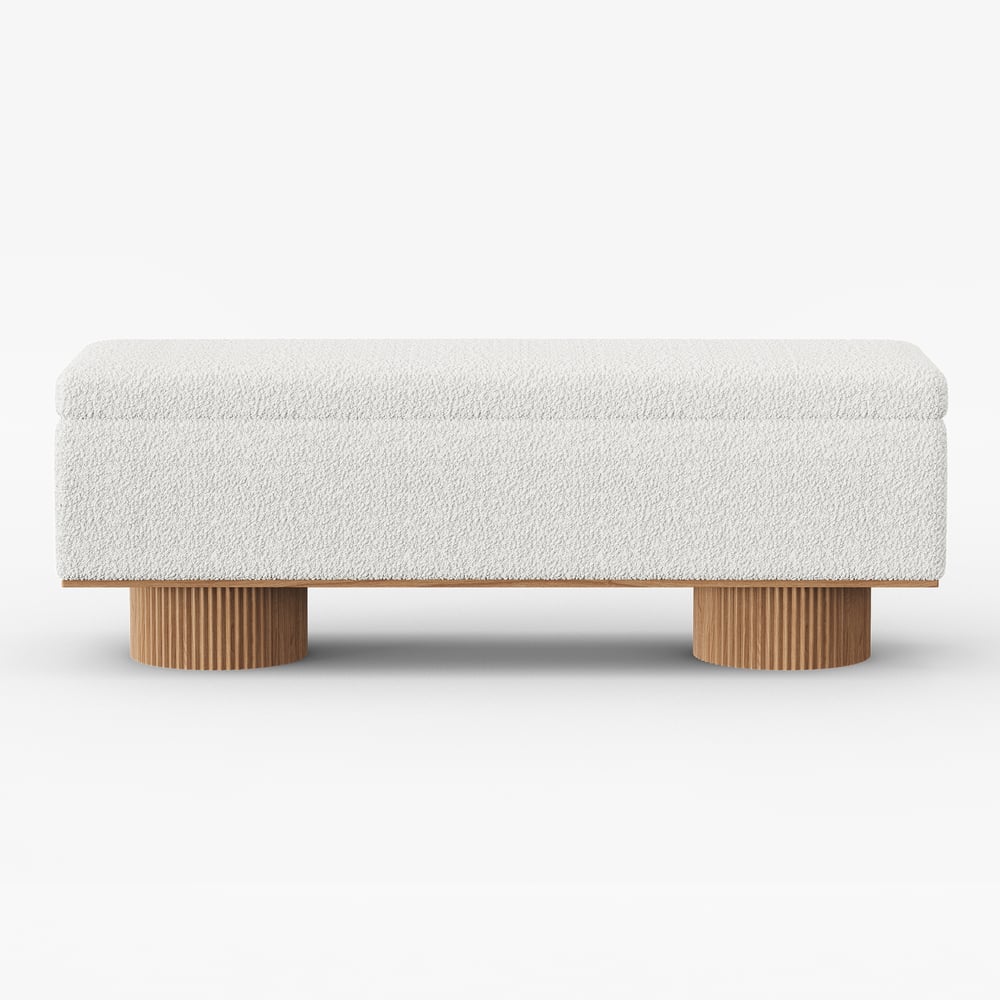 Add style and functionality to your entryway with this elegant boucle bench. Upholstered in cozy boucle fabric, it brings a soft and inviting texture to any space. The unique fluted cylindrical legs, crafted from solid wood with a grooved finish, add a modern sculptural element. Perfect for use as a shoe bench or accent seating, this piece combines contemporary aesthetics with durability. Whether placed in the entryway, living room, or bedroom, it creates a warm and sophisticated ambiance.