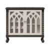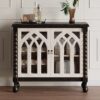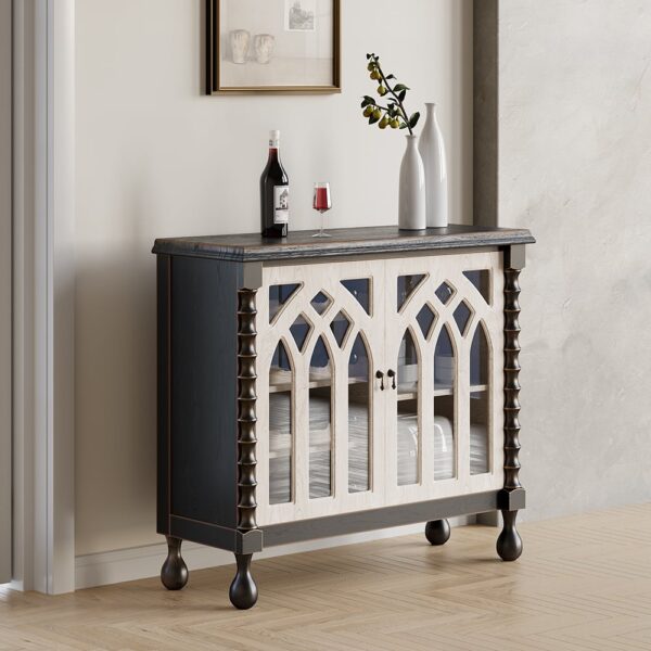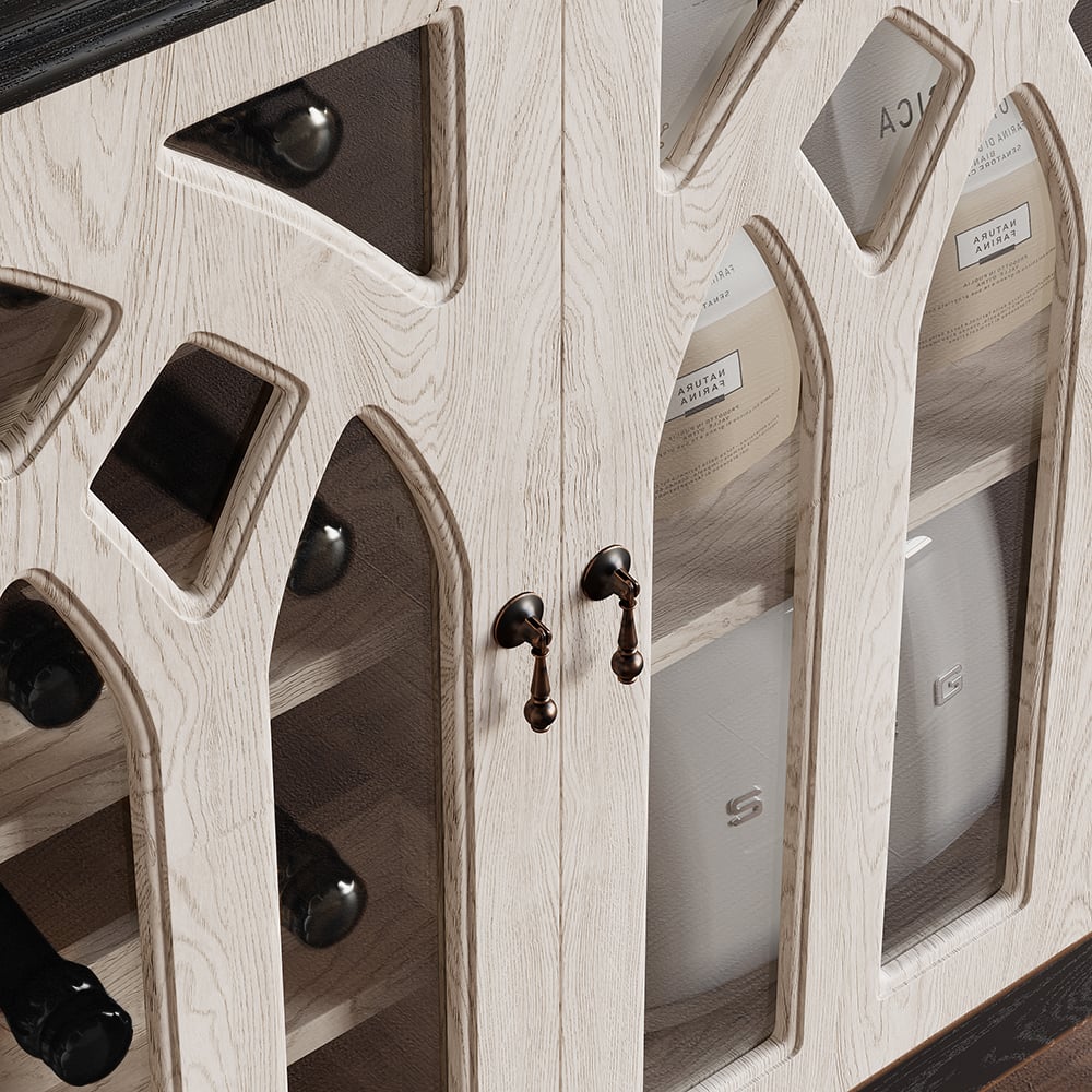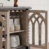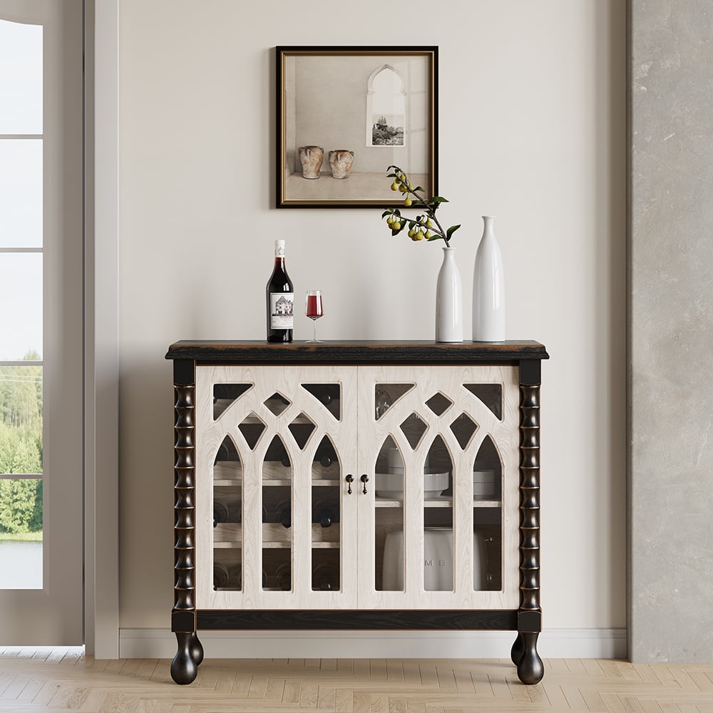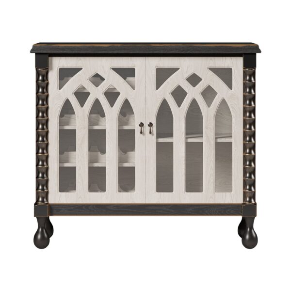 This stunning bar cabinet will make an impressive addition to your dining room or entertainment space. The black-finished outer case is complemented beautifully by the two glass doors with a distressed, lightly finished wood overlay. Plenty of functionality is available with five fixed shelves, and wine bottle and glass storage options. Each fixed shelf has rivets for wine bottles that can accommodate up to 16 wine bottles and three wine glass racks behind the right door Each rack can accommodate up to 3 wine glasses.