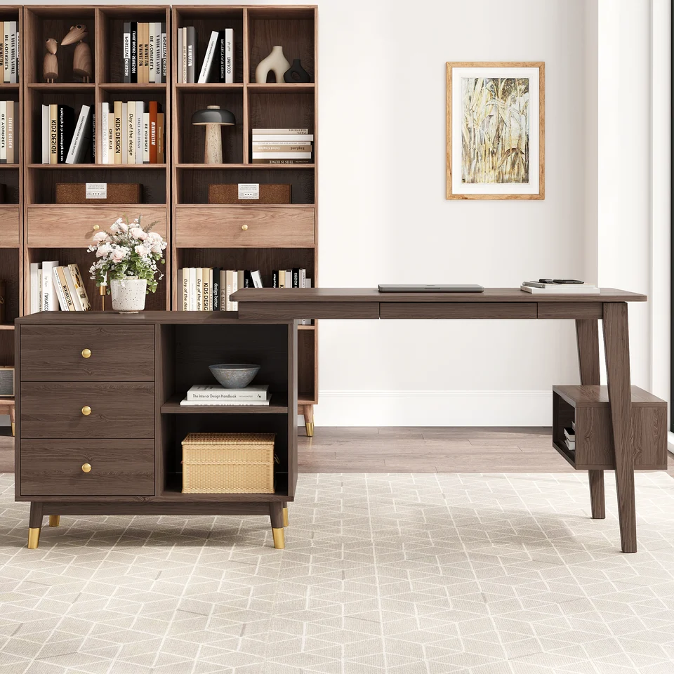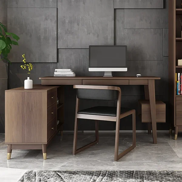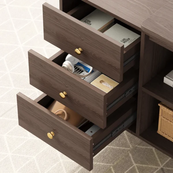 This L-shaped computer desk fits into any corner, ideal for small spaces. Made from manufactured wood with a walnut finish, it offers ample storage: 3 soft-closing drawers on ball-bearing glides and 3 open shelves keep office supplies and study materials within reach. Fully reversible, it can be set up to suit your space best.