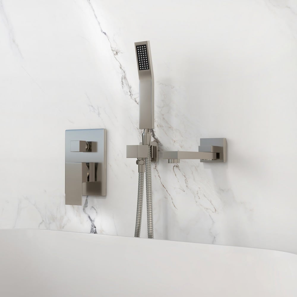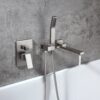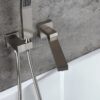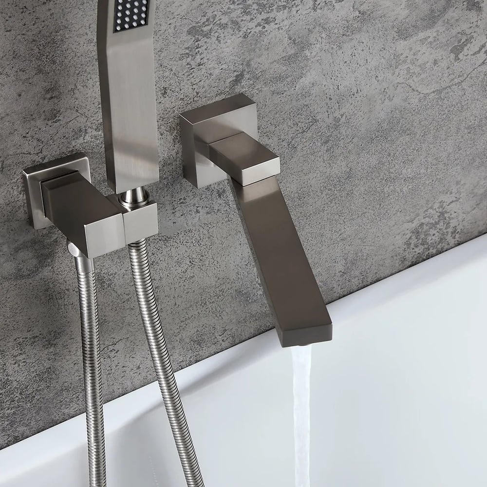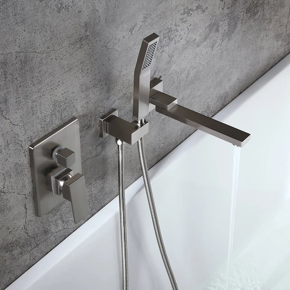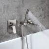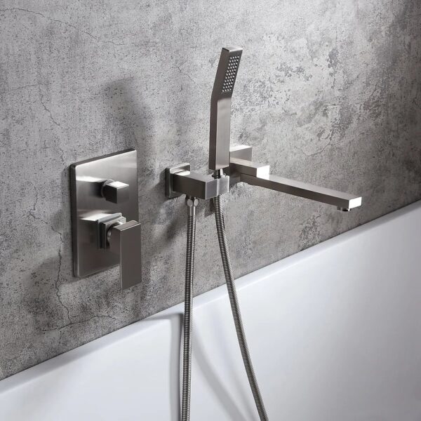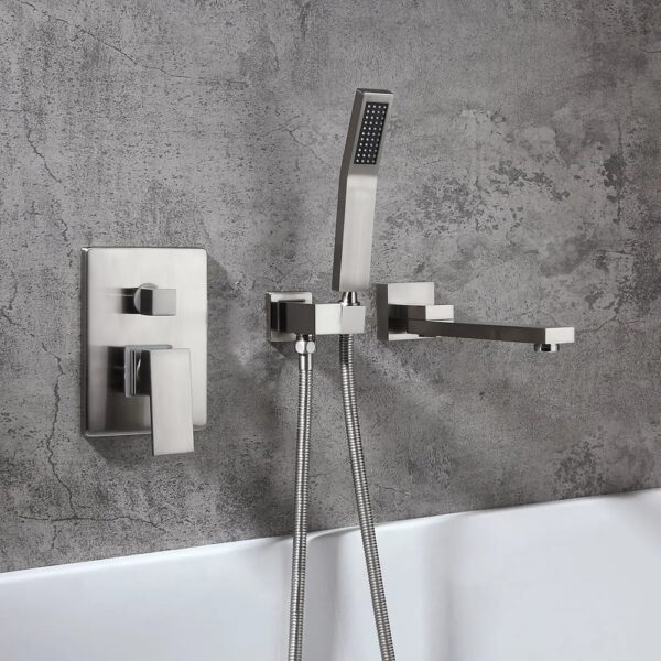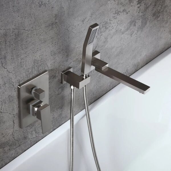 Perfect for bathrooms in need of a stylish makeover, this wall-mount bathtub faucet is a delight for both residential and hospitality settings. It features a slender, elongated tub spout that moves from left to right 180 degrees for greater reach and convenience. When not in use, the smart swivel design keeps it out of the way for a sleek, clean look. While a handheld shower at easy access improves your bathing experience, a 2-function valve makes operation a breeze. Comes in brushed nickel, it fits into your existing decor effortlessly.
