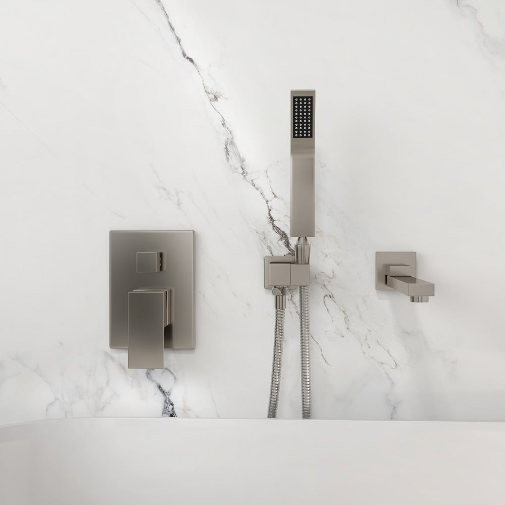 – A single handle to control temperature and volume, while a knob to divert water to either tub spout or hand shower.