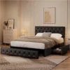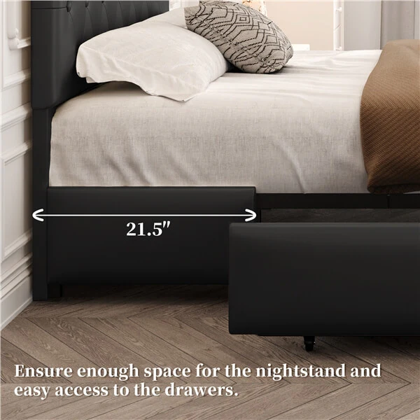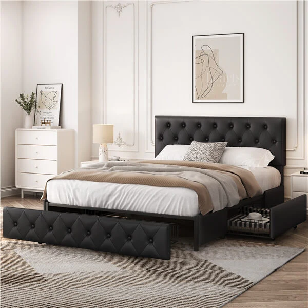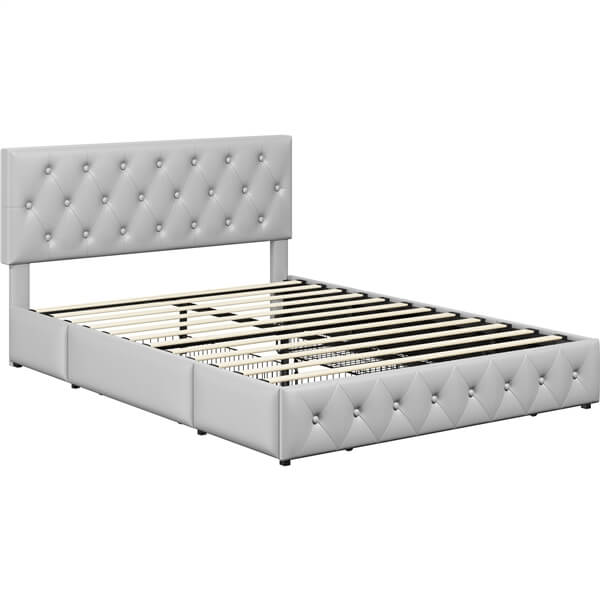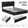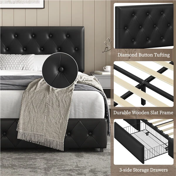 Queen/Full Size Bed Frame with Adjustable Headboard and Three Drawers Storage, Diamond Button-Tufted Headboard, Faux Leather Upholstered Mattress Foundation with Sturdy Wood Slat Support, No Box Spring Needed