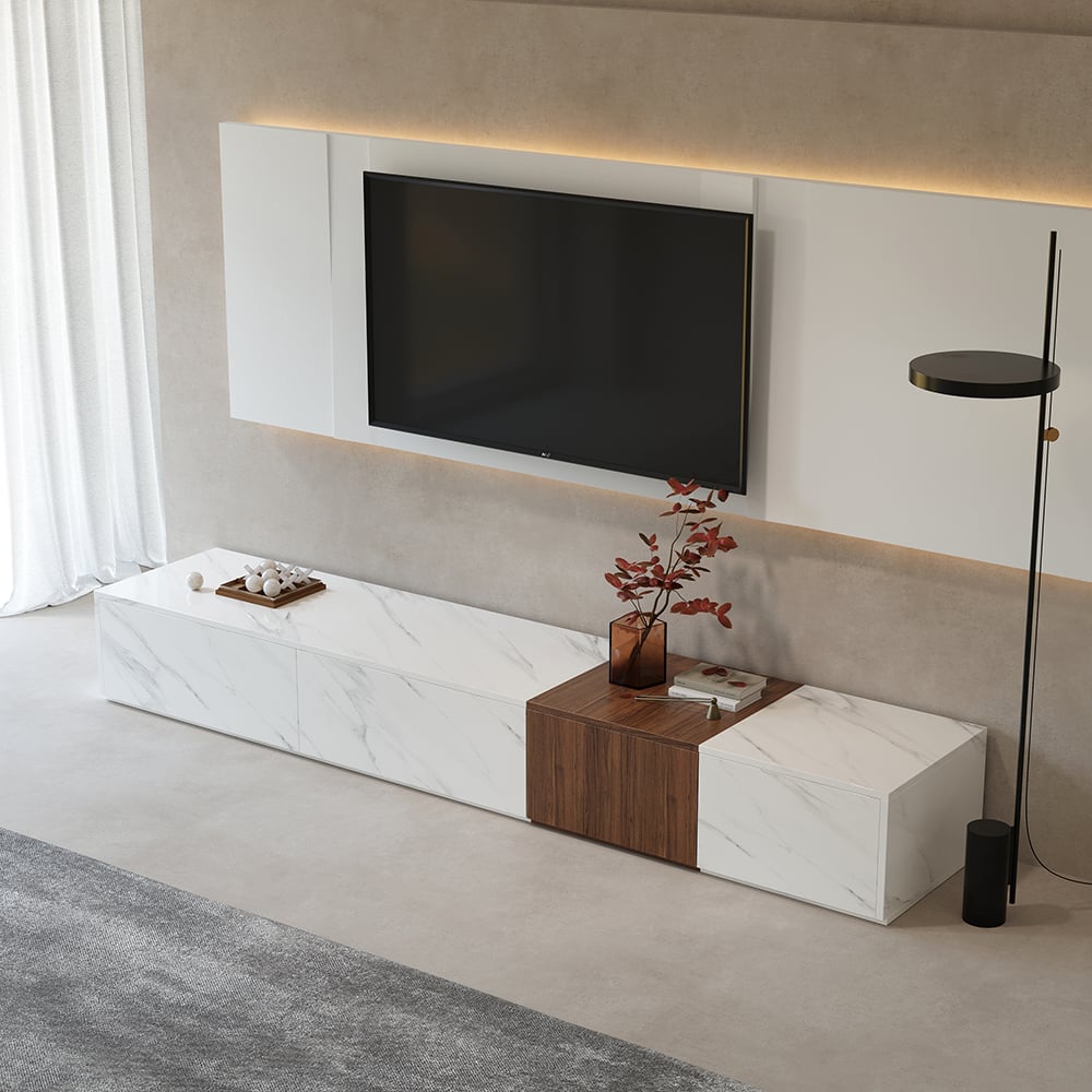 The coffee table is constructed from pure white marble veneer and walnut wood veneer finish and incorporates aesthetically visible grain details. It includes 2 spacious drawers and stores a wide range of DVDs, video games, remote control units, and so on. From enjoying snacks and coffee to offering spacious storage, it fits any space.