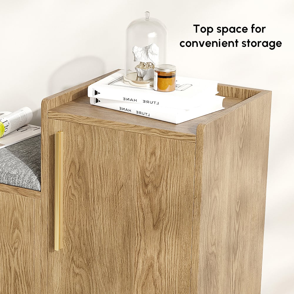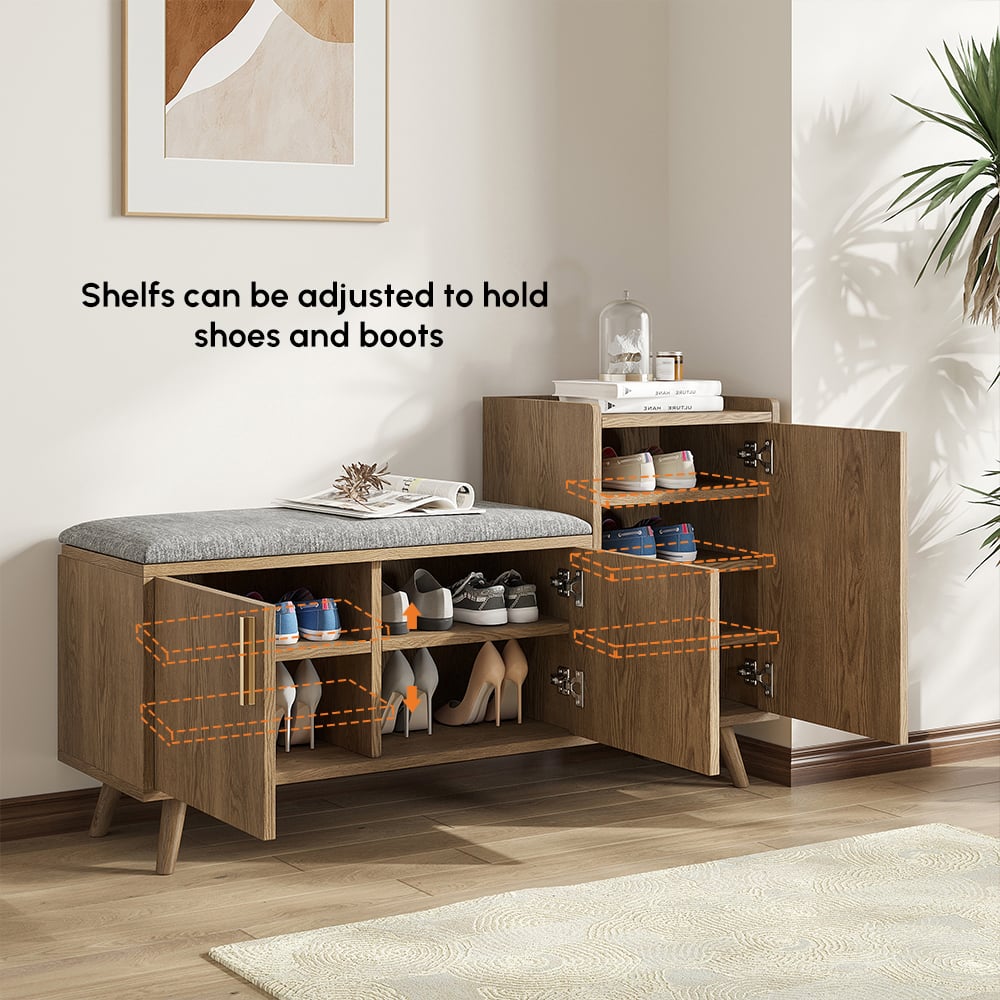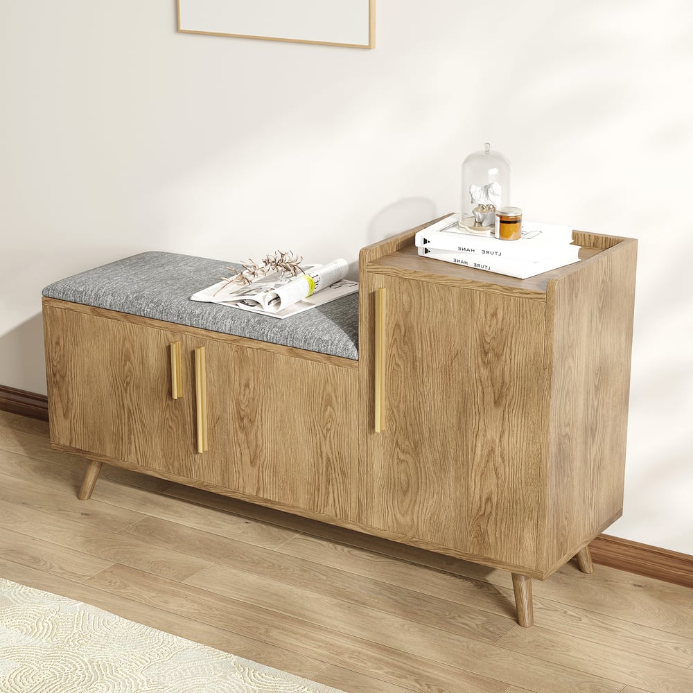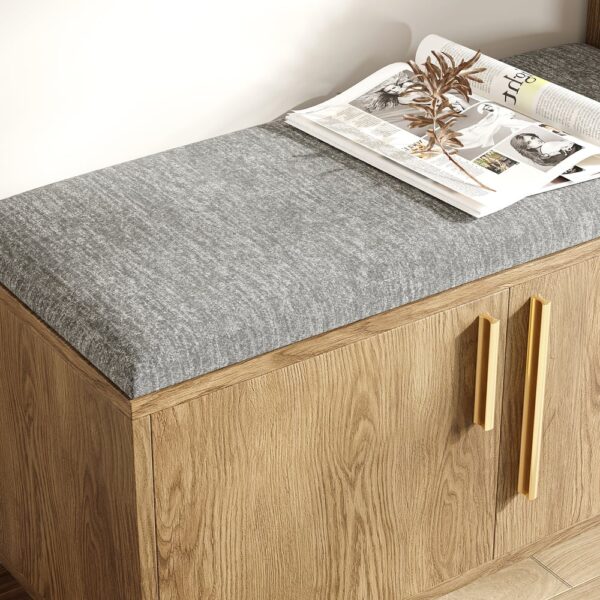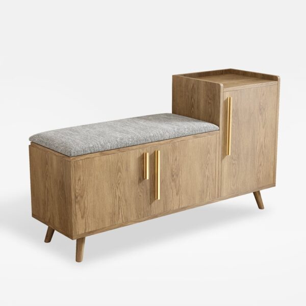 This entryway bench with a right-side cabinet for storing sneakers and boots, plus a padded cushion for comfort, is inspired by modern minimalist design. It adds elegance and practicality to your living room, entranceway, or hallway to make it generally stylish and functional.