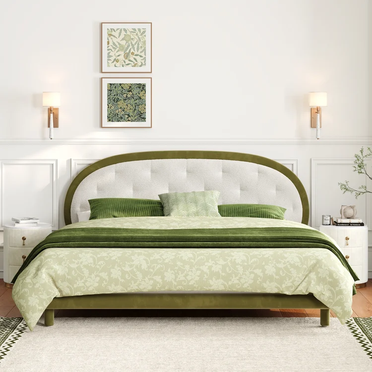 Indulge in the luxury with king size upholstered bed, where modern elegance meets cozy comfort. The unique oval-shaped headboard is wrapped in soft boucle, while the lush velvet adds a splash of glamour. Crafted with care for lasting durability, this bed will transform your bedroom into a serene sanctuary.