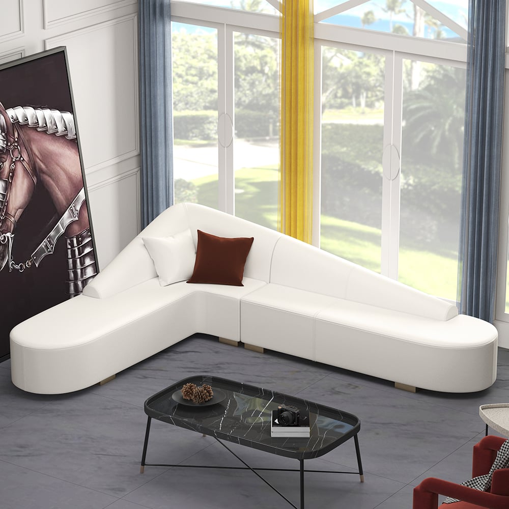 White Modern L-Shaped Corner Sectional Sofa for Living Room Faux Leather Upholstery