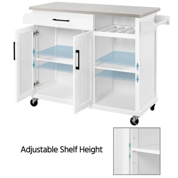 - EXTRA WORKSURFACE AND ROOM: The stainless steel countertop which measures 42” x 18” (L x W) provides you with an extra work surface as you prepare, serve, and stow food or little kitchenware. Besides, a pull-out drawer on full extension metal slides offers out-of-sight storage for silverware and napkins; a small wine rack can hold 4 bottles of wine; the open shelves and cabinet store your utensils and appliances neatly; a spice rack and a tower bar keep small bottles and kitchen towels on hand.